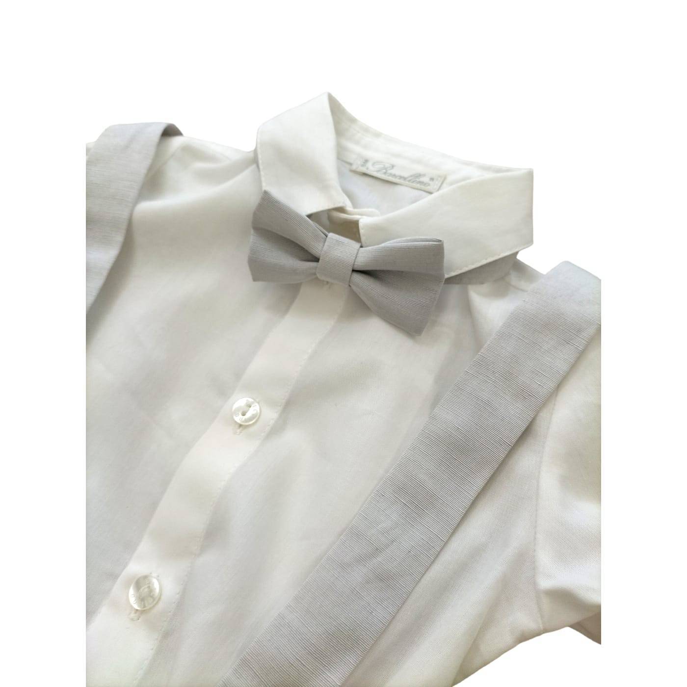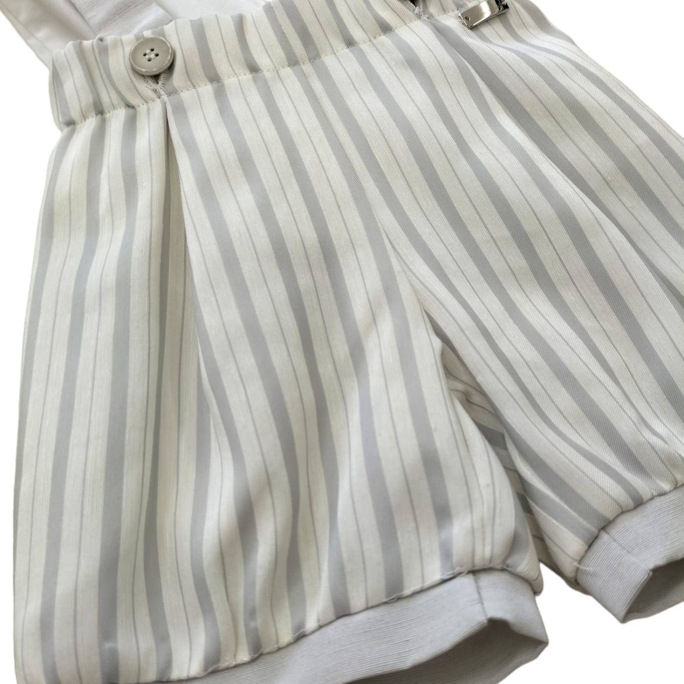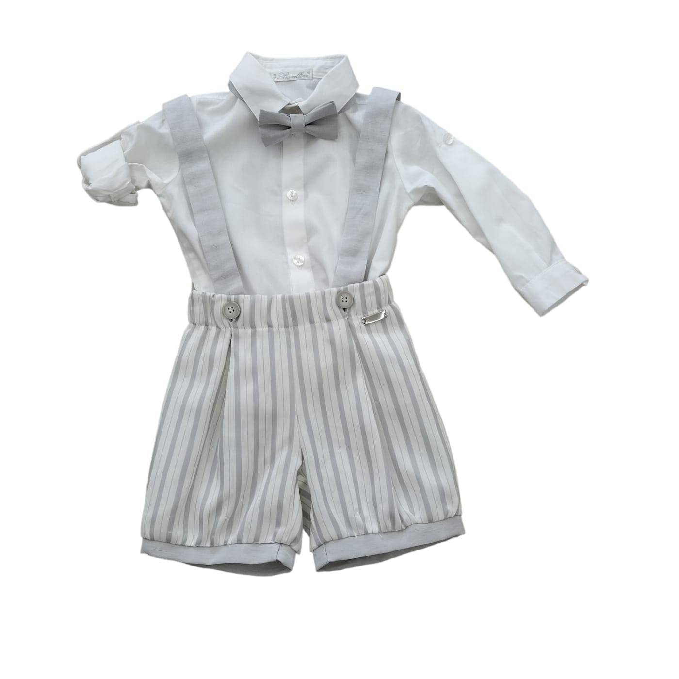 Elegantes, für hochsommerliche Anlässe geeignetes Kinderoutfit, bestehend aus einer langärmeligen weißen Baumwollbluse, die dank der Knöpfe am oberen Ärmel hochgekrempelt werden kann, hellgrau und cremefarben gestreiften Bermudashorts mit Halbglanzeffekt und grauen Shantung-Hosenträgern passend zur Fliege.