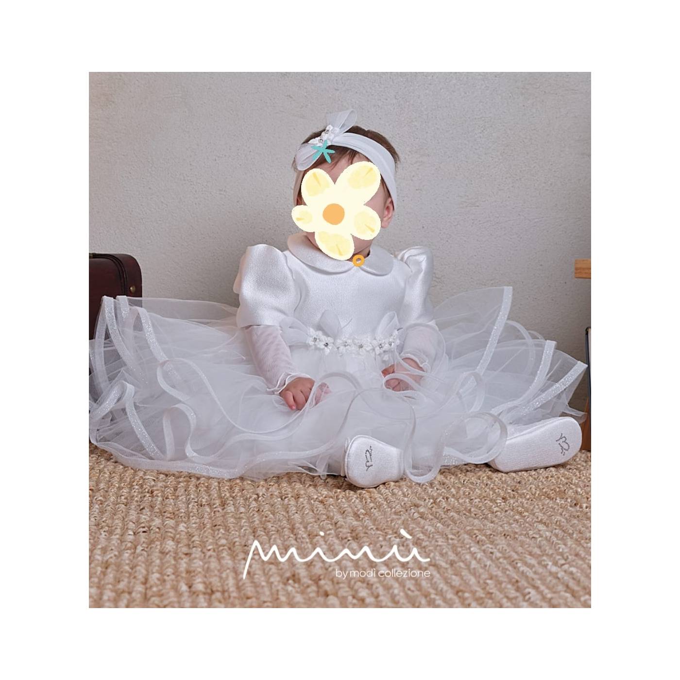 Elegantes weißes Baby-Mädchen-Taufkleid von der Marke Minù. Unifarbenes Mieder und kurzer Ballonärmel, von dem aus sich der lange Tüllärmel fortsetzt, am Ende des Mieders finden wir Blumen mit Glitzer in der Mitte, die dem Kleidungsstück Glanz verleihen, schließlich der Rock mit Puppeneffekt aus mehrlagigem Tüll, der mit glitzernden Volants neu definiert wird.