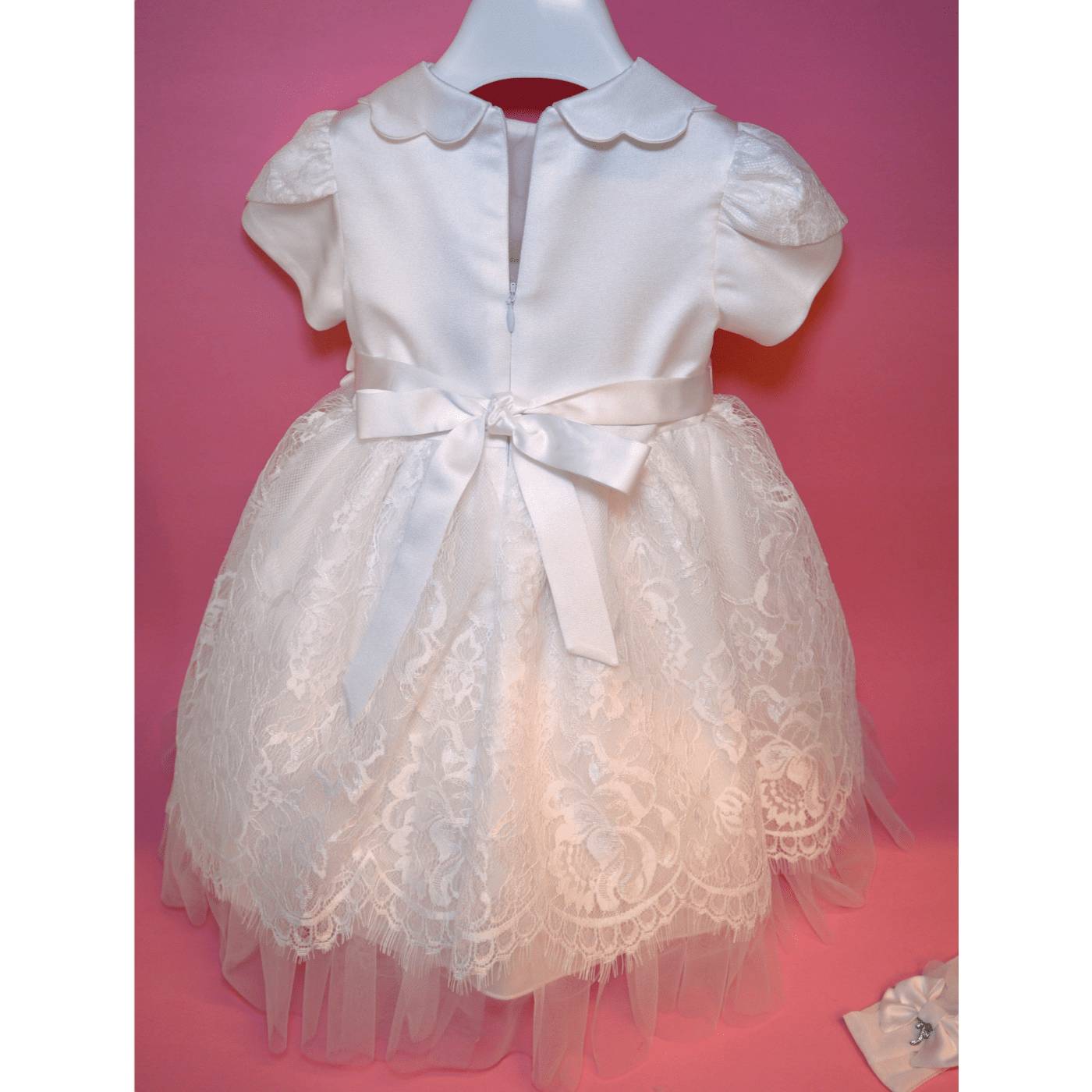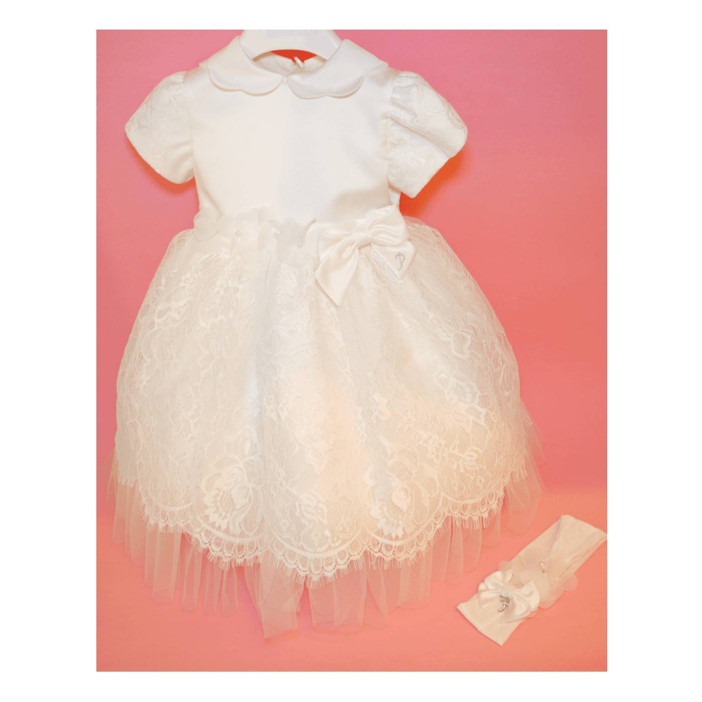 Weißes Taufkleid mit Mieder und Kragen aus Seidensatin. Der Kragen ist mit Schleifen verziert, die kurzen Ärmel sind mit Spitze besetzt. An der Taille ist der Scheinbund auf der einen Seite mit einer eleganten Schleife, auf der anderen Seite mit Blumen mit erhabenen Blütenblättern und einer Perle in der Mitte der Blumen verziert, die gleichen Blumen befinden sich auf dem Haarband, begleitet von einer kleinen Schleife. Der Rock ist vollständig mit exquisiter Spitze gefüttert.