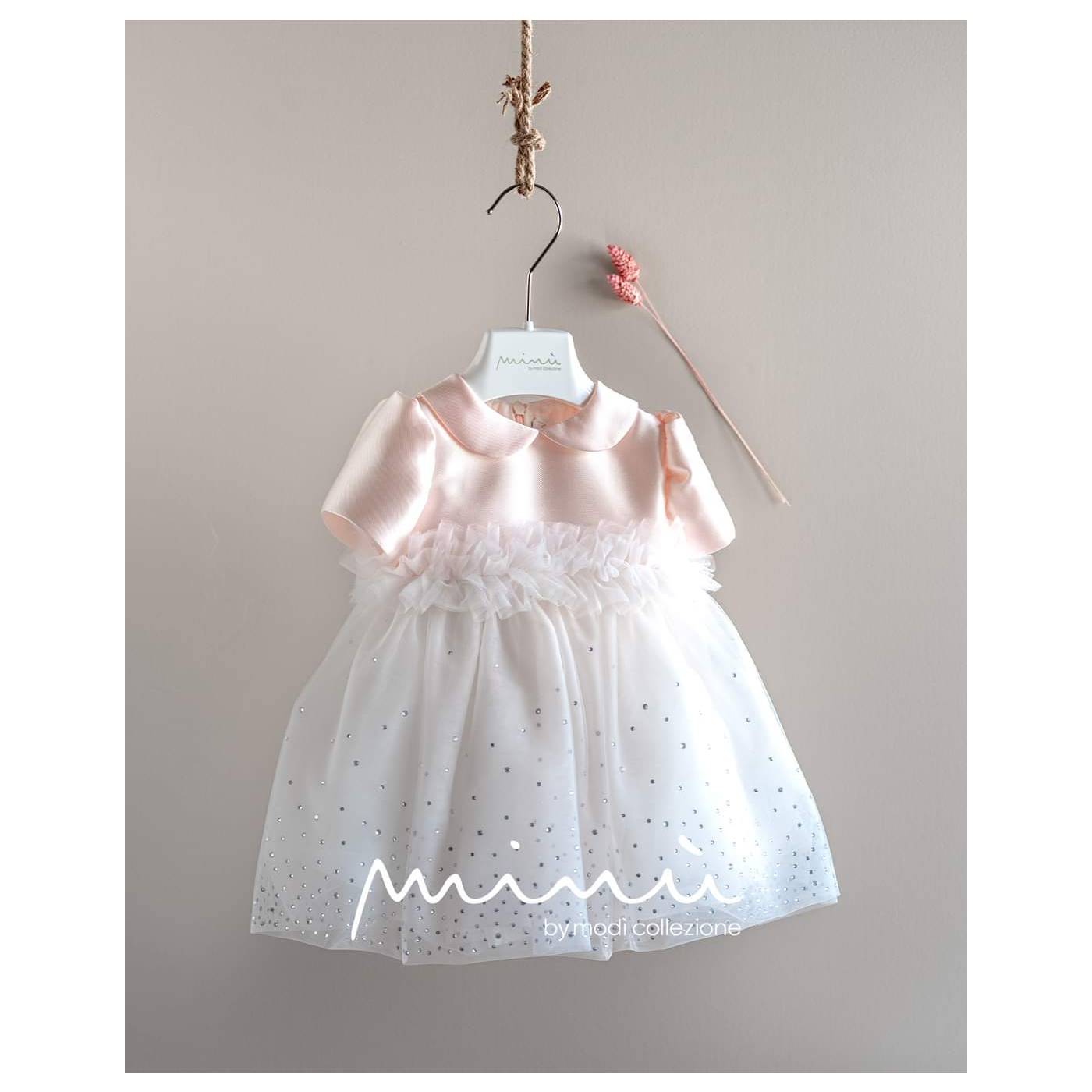 Schlichtes Mieder in Pfirsichrosa, ab den halben Ärmeln setzt sich der Tüll fort, der einen durchsichtigen Effekt auf den Armen des kleinen Mädchens erzeugt, was es noch eleganter macht; an der Taille ein Rüschenband aus Faux-Tüll; breiter Rock aus mehrlagigem Tüll, der mit zahlreichen Strasssteinen besetzt ist. Auf dem Rücken eine Schleife mit Schwanz. Das Ganze wird von einem Haarband aus weichem Grund begleitet, das durch die Schleife, die die rosa Farbe des Kleides aufgreift, bereichert wird.