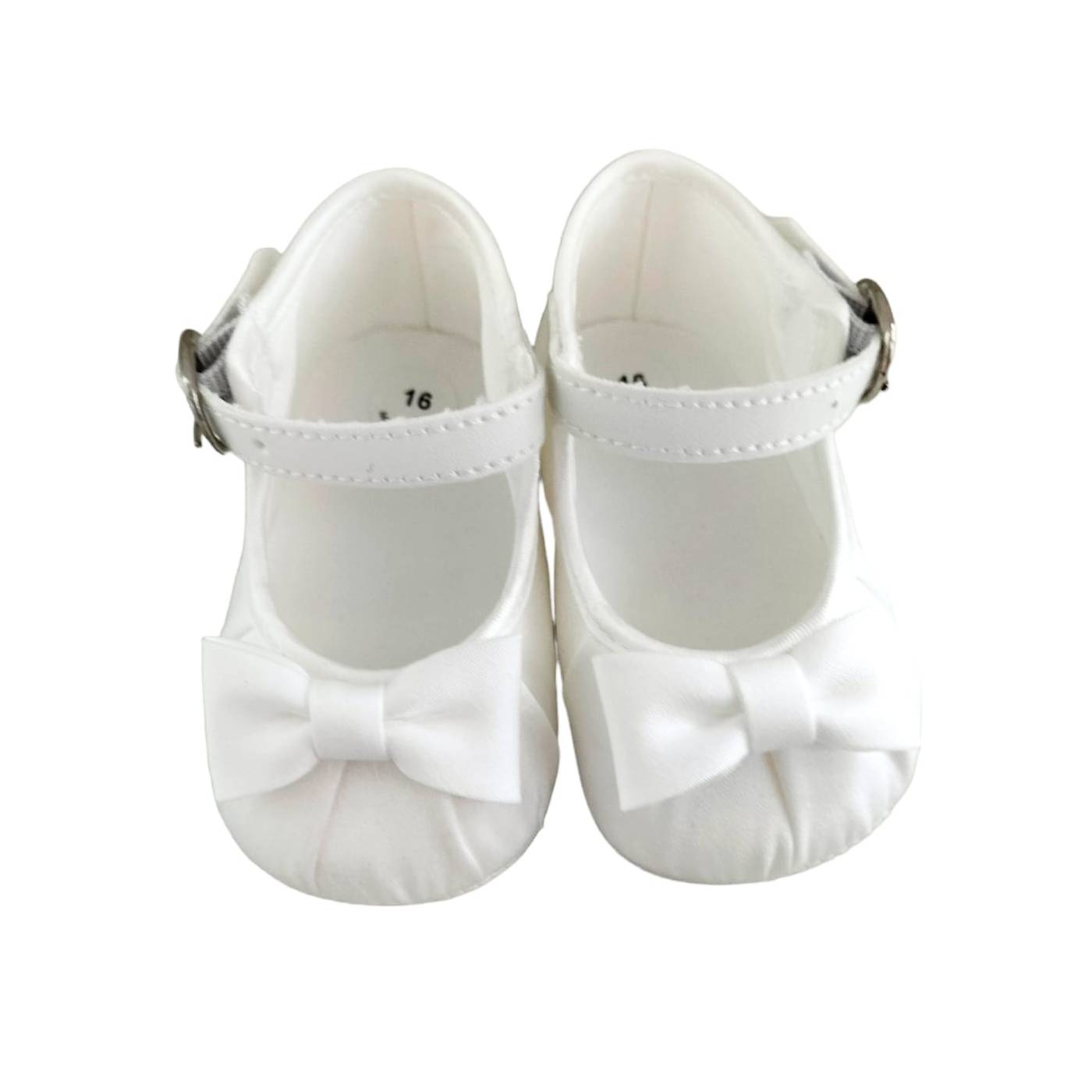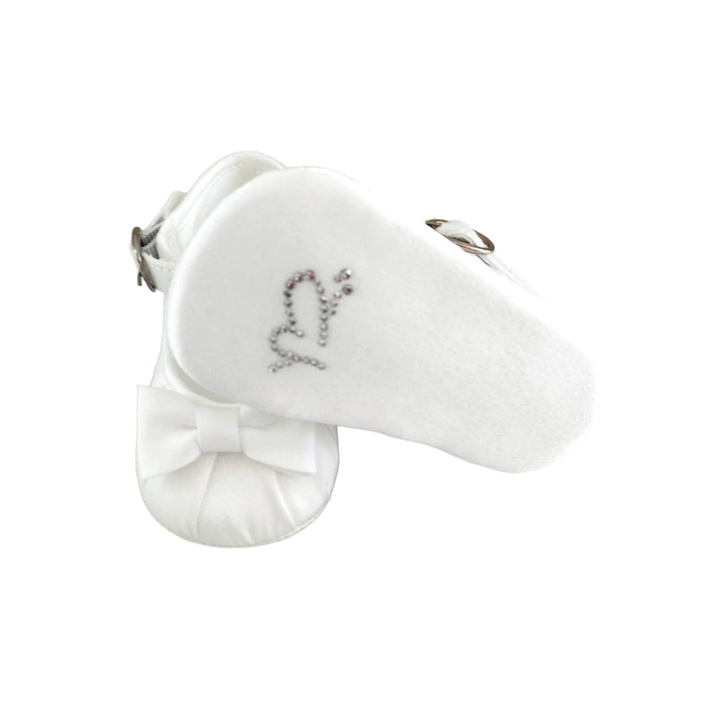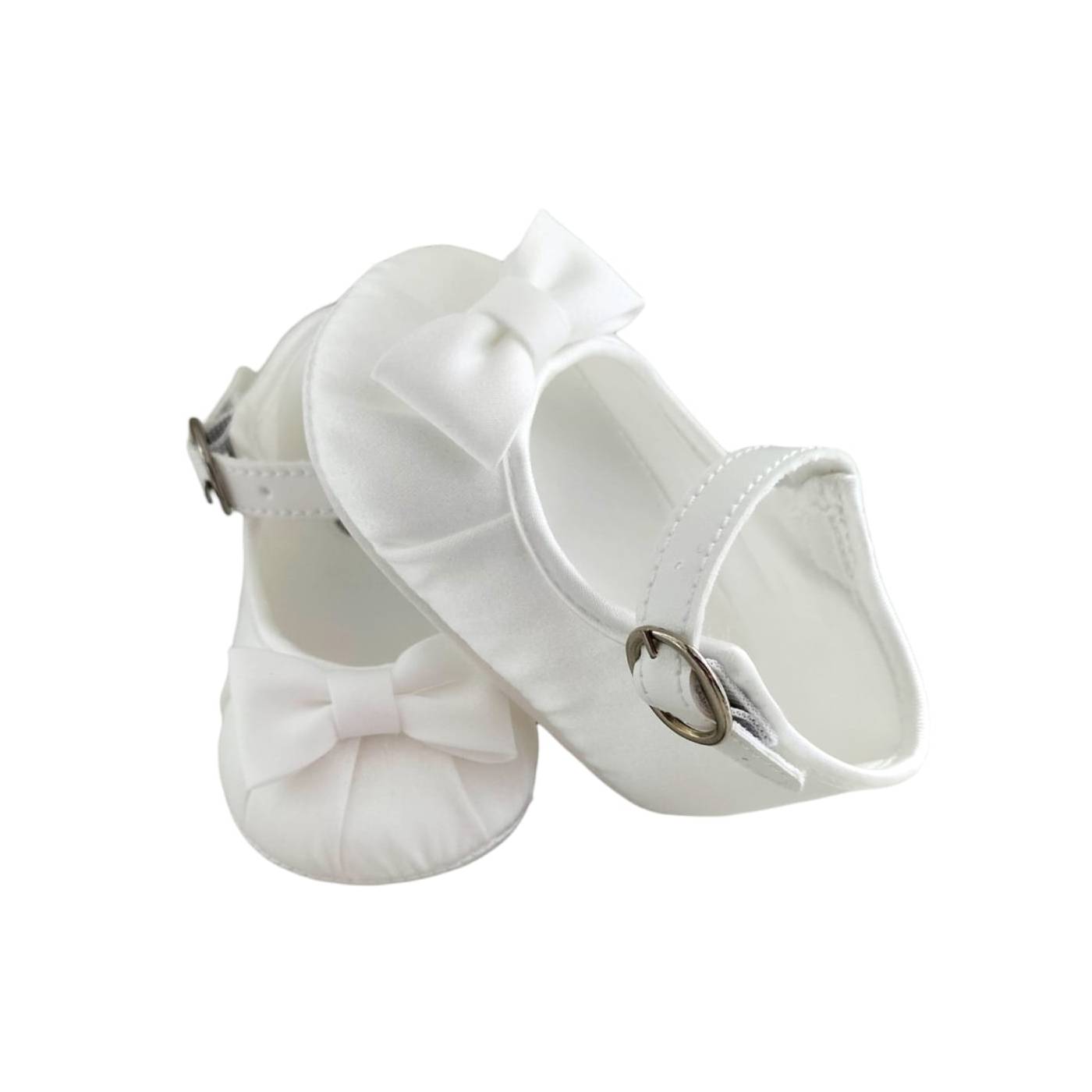 Eleganter und weicher weißer Seidensatin-Taufpantoffel mit zentraler Schleife und Schnallenverschluss. Geeignet für die Taufe.