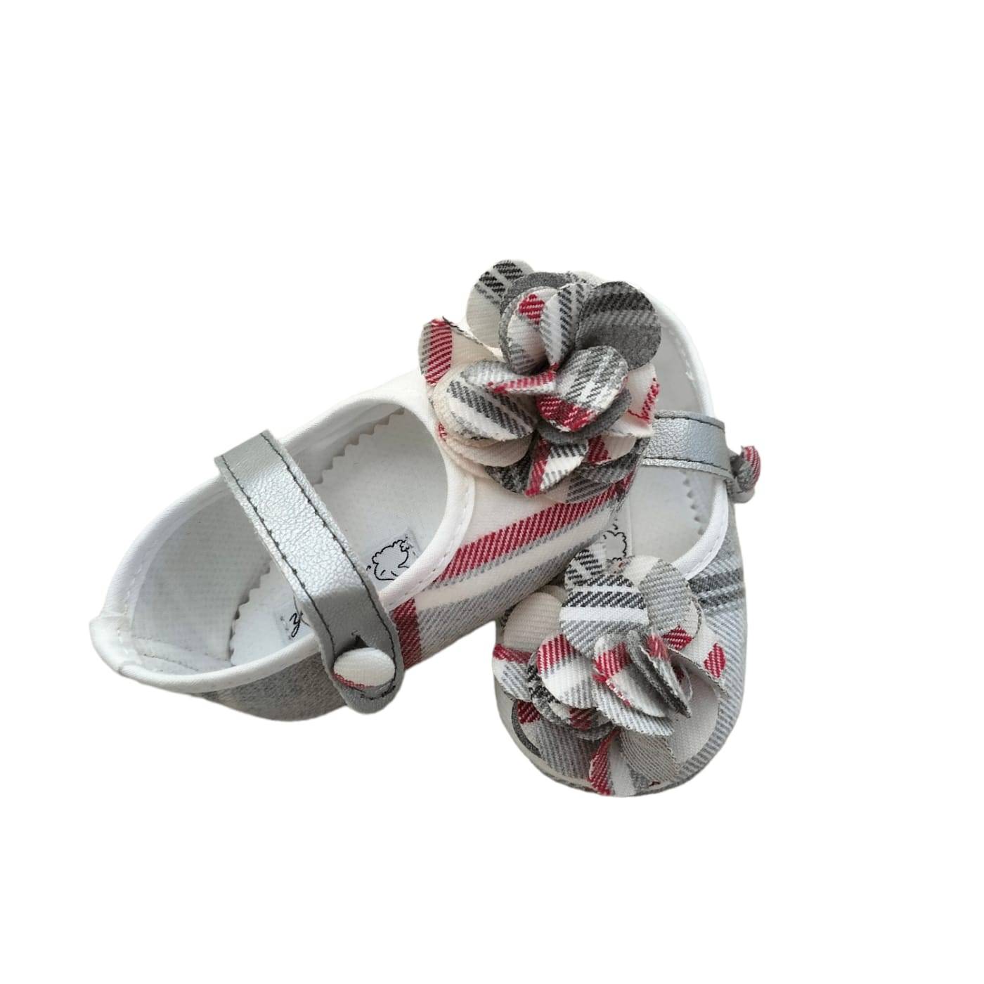 Weiche Wiege Baby Booties von der Marke Ninnaoh Größe 16. Hergestellt aus grauem, rotem und cremefarbenem Tartanstoff. Ideal für die Winterzeit.