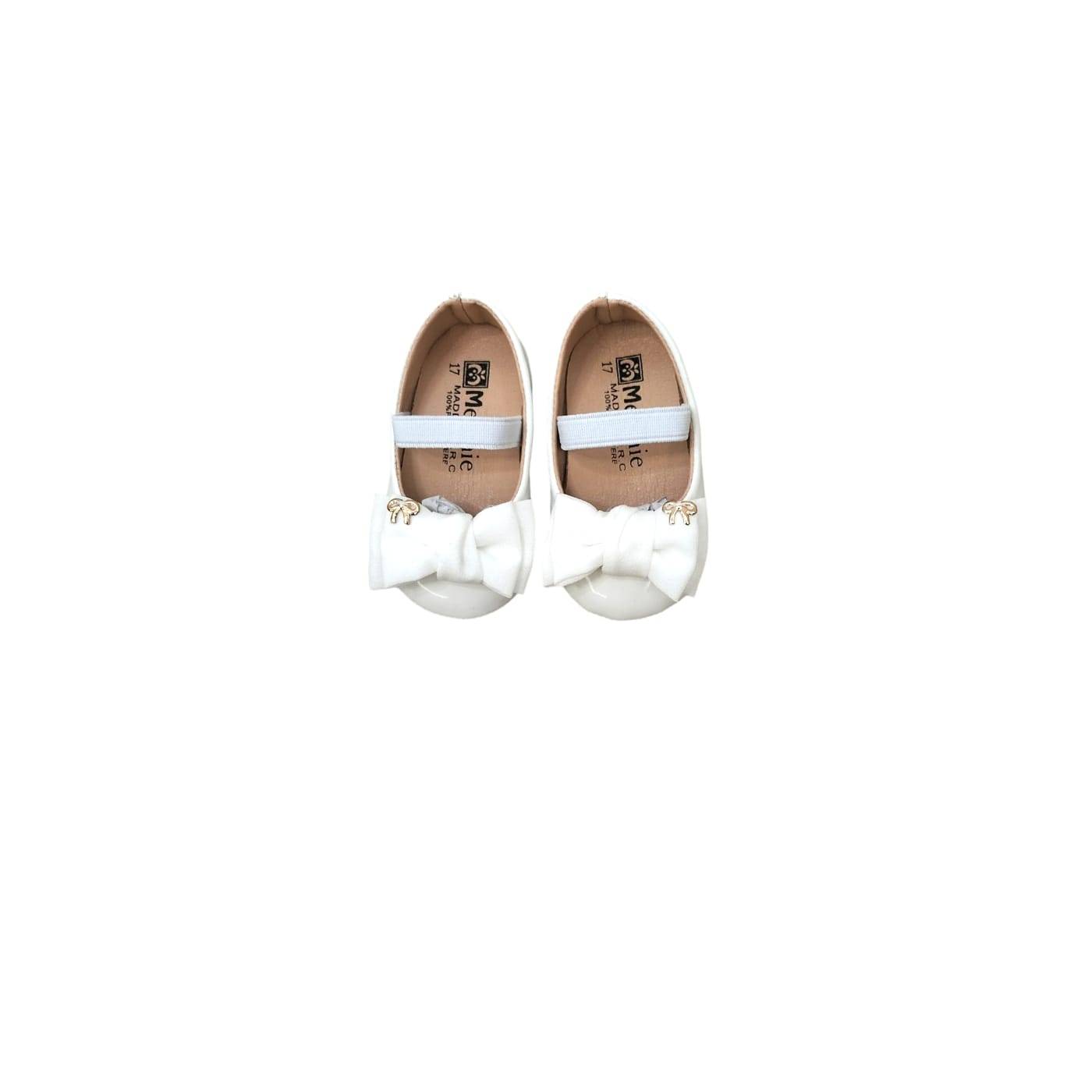 Eleganter, weicher Wiegen-Ballettschuh aus weißem Lackleder mit Seiden-Organzaschleife. Geeignet für besondere Anlässe.