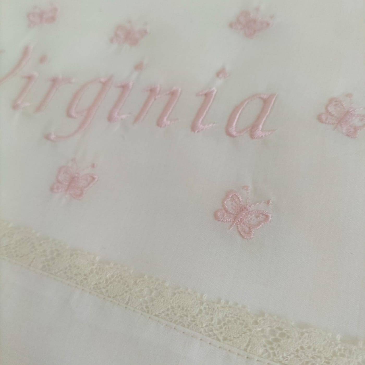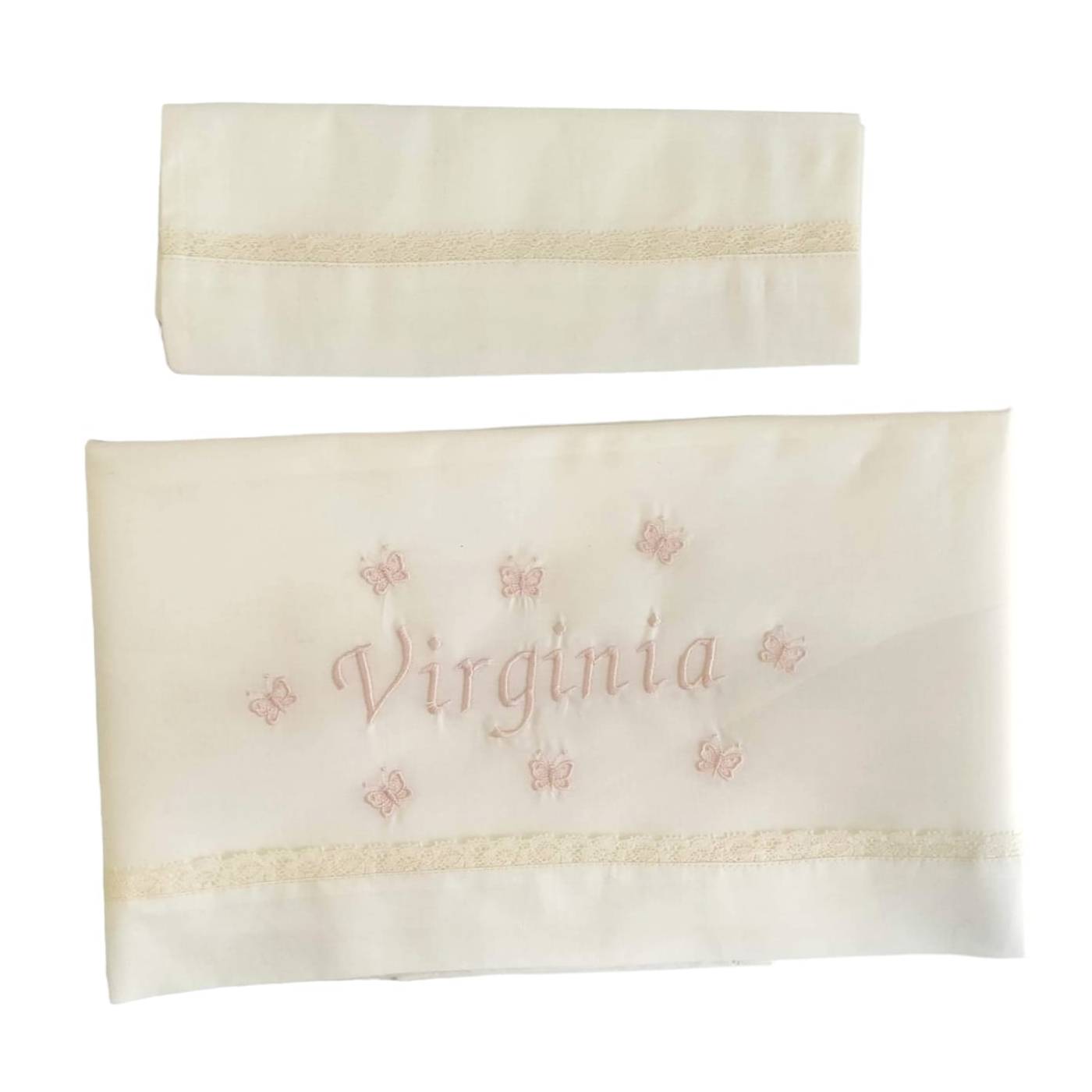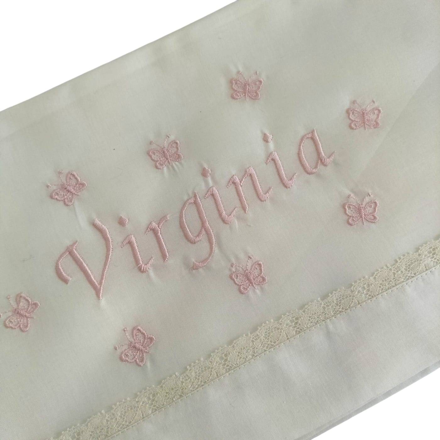 Bettlaken für ein kleines Mädchen aus sehr weichem cremefarbenem/elfenbeinfarbenem Baumwollbatist. In der Mitte steht der Name des Babys, umgeben von zarten, flatternden Schmetterlingen, die alle in Rosa gestickt sind.