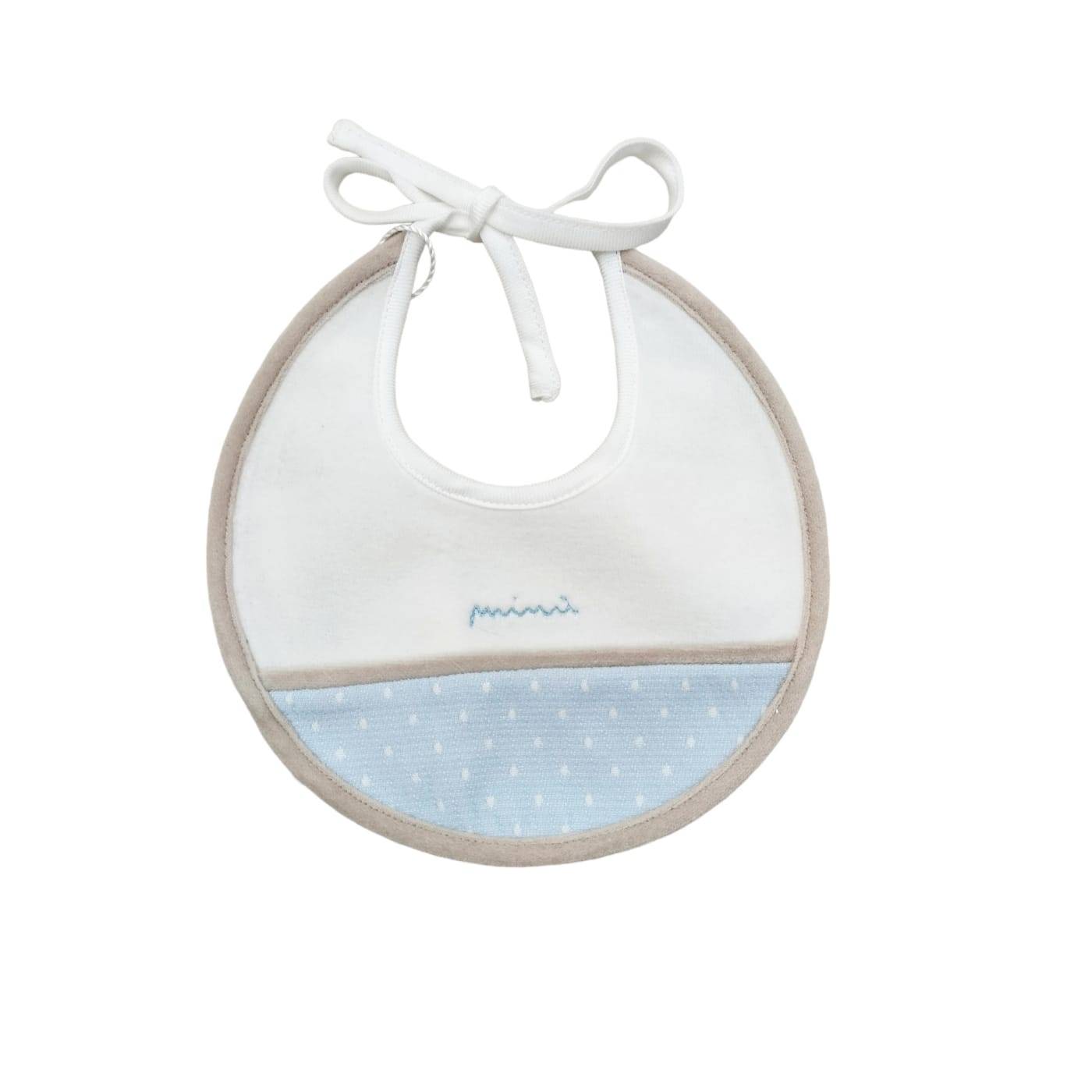Komplett mit allem: weißer Chenille-Bezug mit abnehmbarer Füllung dank der Öffnung auf der Rückseite mit Knöpfen; Laken (3-teilig mit Kissenbezug und darunter mit Ecken) neu definiert mit hellblauem und taubengrauem Volant und in der Mitte ein kleines gesticktes Logo der Marke "Minù"; das 2-teilige Set mit einer Größe von 1 Monat entsprechend 50/58 Zentimetern hat Knöpfe auf der Rückseite, um das Einsetzen zu erleichtern; Mützchen unerlässlich für die ersten Lebensstunden des Babys und Lätzchen, alles aufeinander abgestimmt.