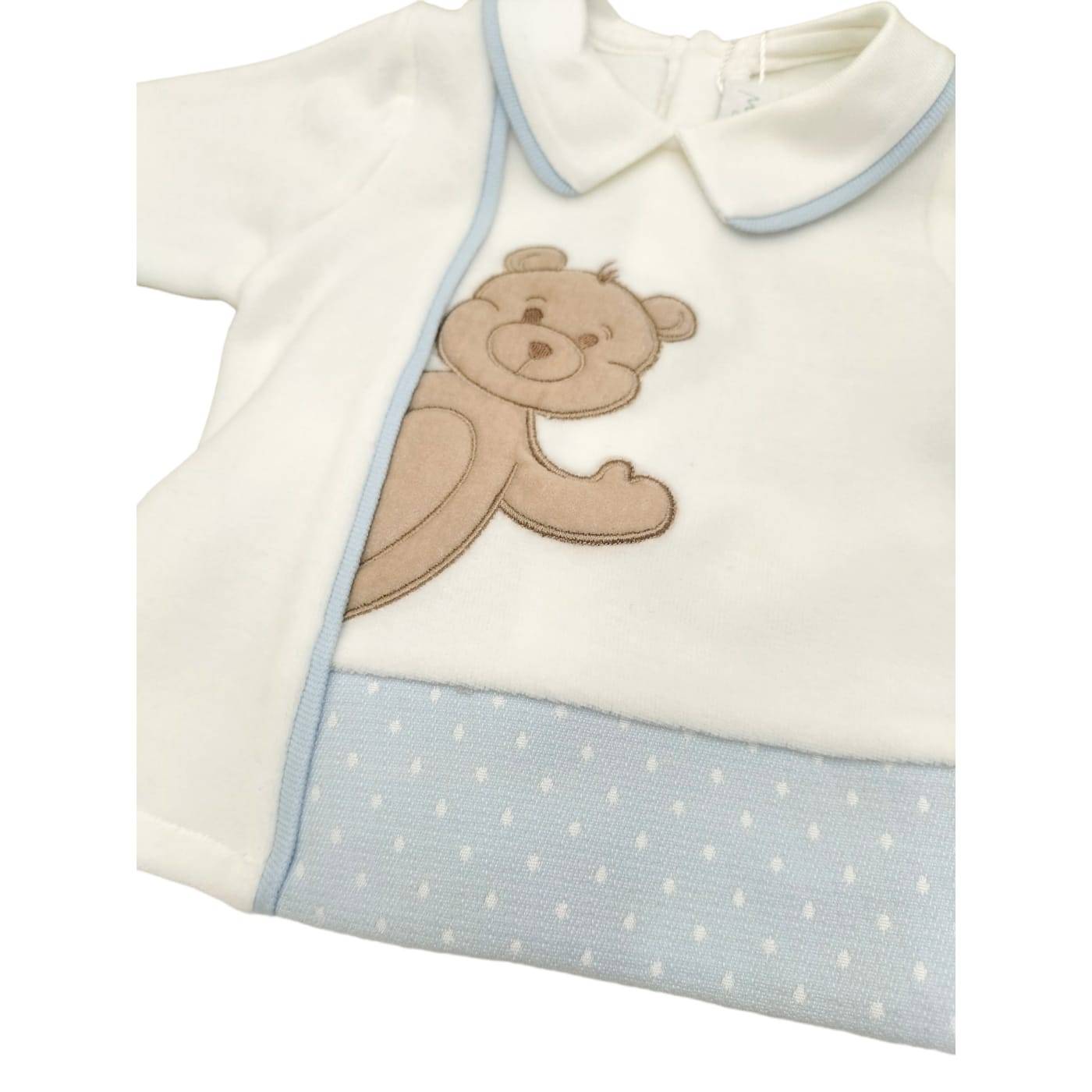 Dieses Chenille-Set für Neugeborene der Marke Minù besteht aus Stoffen in den weichen Farben Weiß, Taubengrau und Hellblau mit kleinen weißen Punkten, was alles sehr zart und süß macht, auch dank des niedlichen Teddys auf dem Bezug und der Decke.