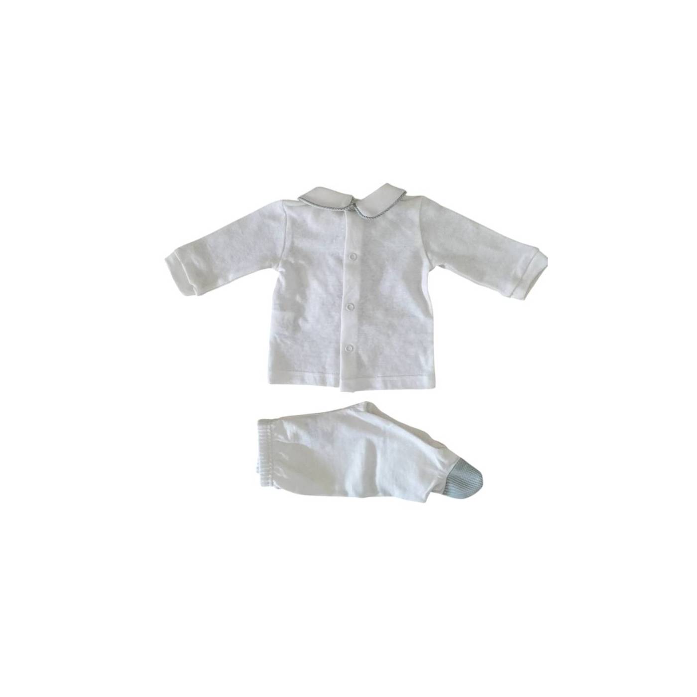 Einfacher weißer Babyschlafanzug mit salbeigrünen Details. Das Besondere an diesem Schlafanzug ist der Stoff 55% Leinen 45% Baumwolle, ein weicher, kühler, atmungsaktiver und antiallergischer Stoff.