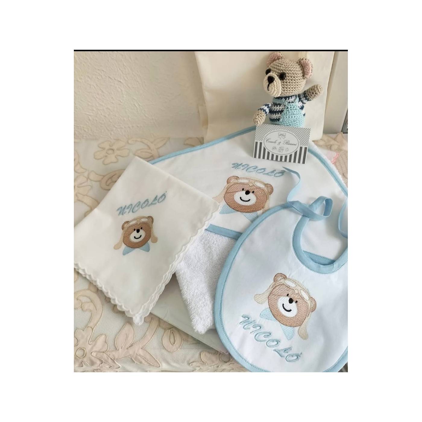 Set bestehend aus 4 Teilen: Bademantel, Musselin-Lätzchen mit gesticktem Bär und Häkelbär.