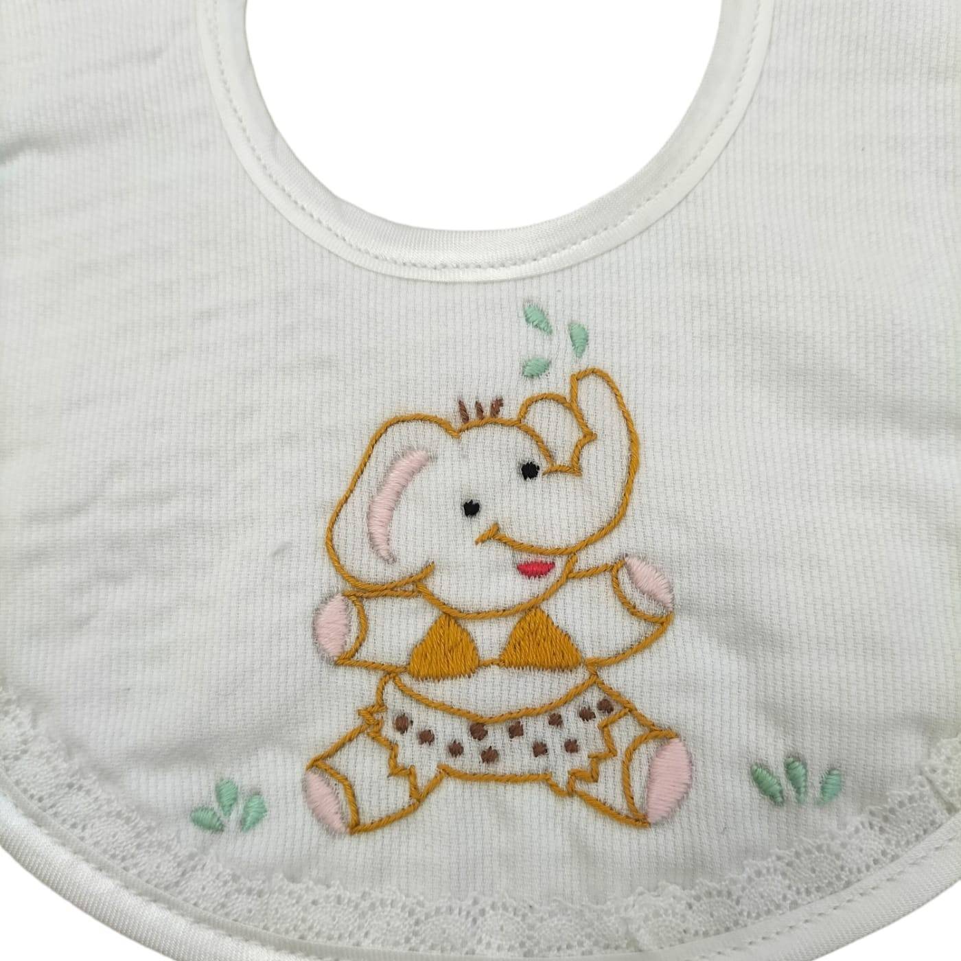 Baby-Lätzchen mit weißem Hintergrund und handgestickt mit einem süßen kleinen Elefanten. Definiert mit Satin Schrägstrich und weißer Spitze. Befestigung mit Schnürsenkeln.
