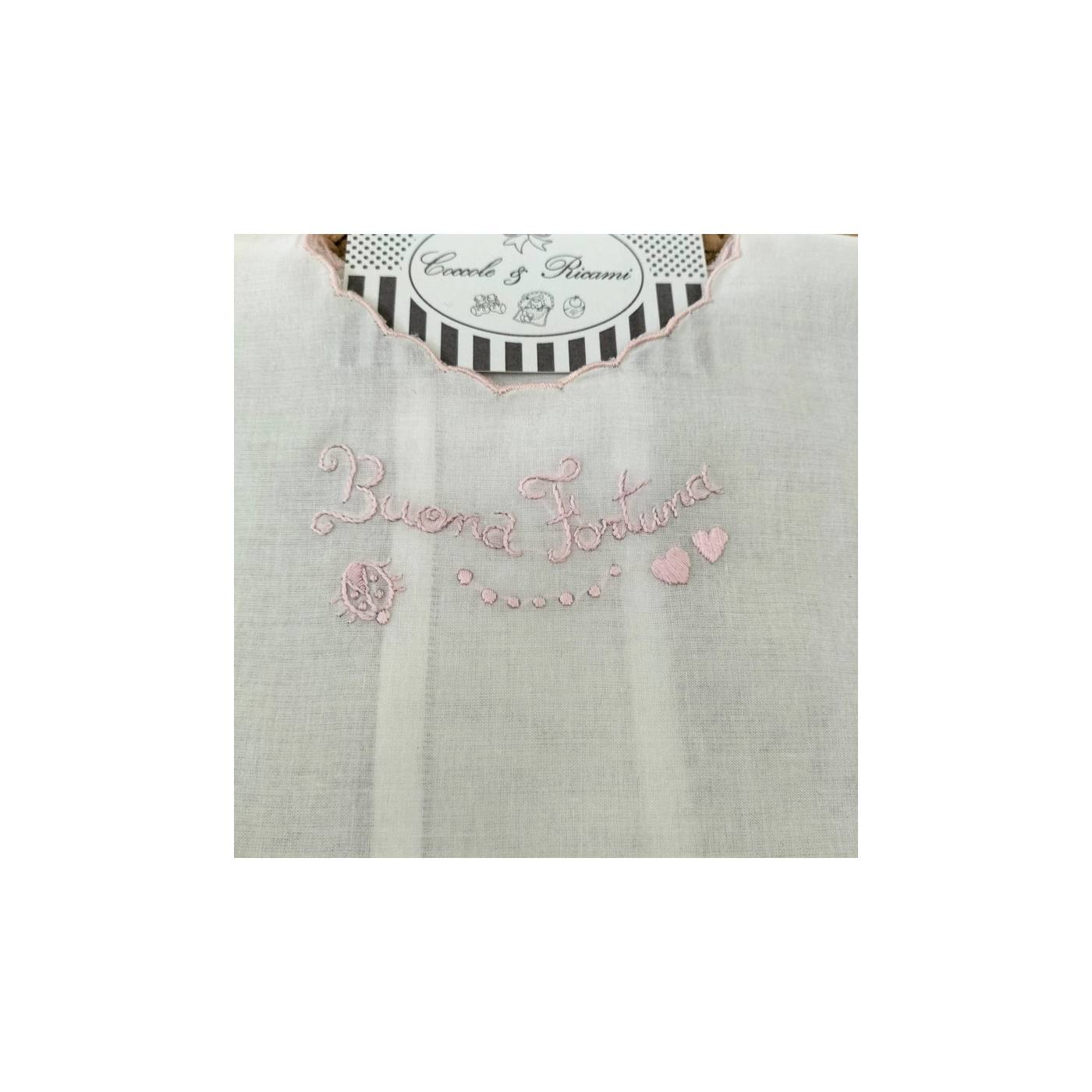 Hergestellt aus 100% reiner Baumwolle in Weiß und handbestickt in Rosa mit der Aufschrift "Good Luck".