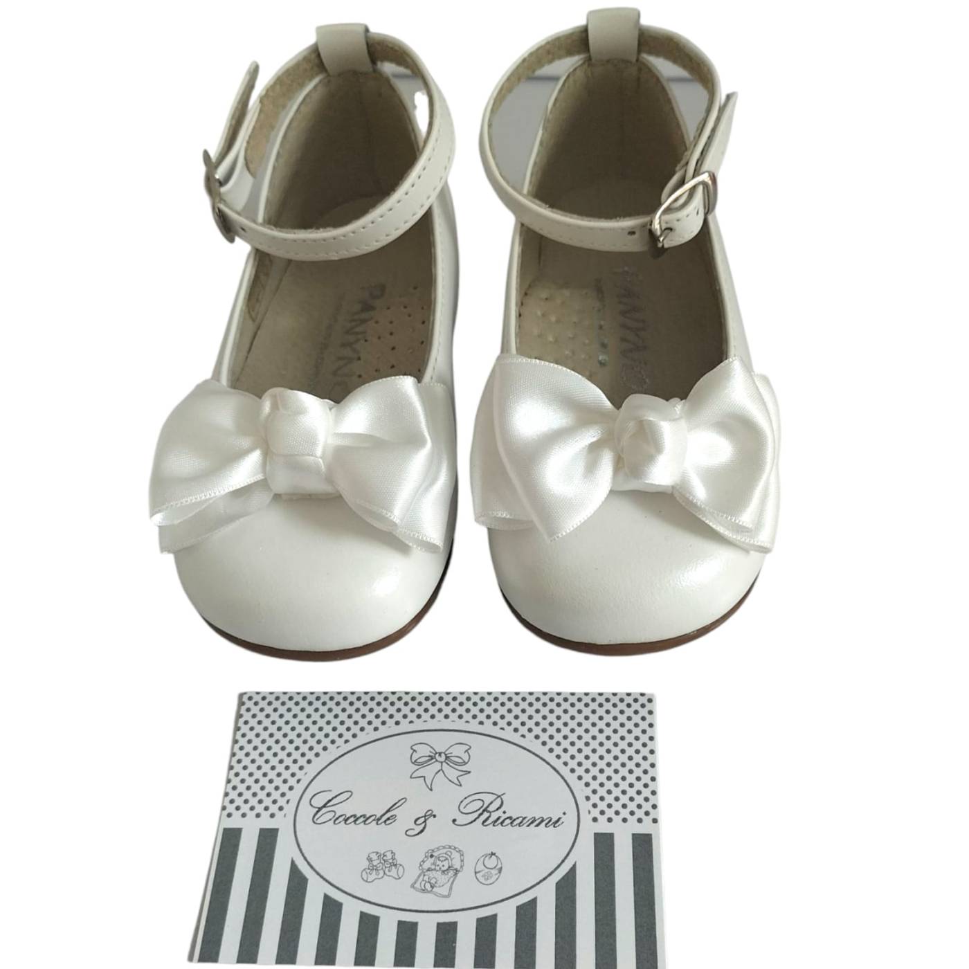 Eleganter Ballerina aus weißem Lackleder mit silberfarbener Seitenschleife und Schnallenverschluss. Anatomisches Fußbett und braune, rutschfeste Sohle.