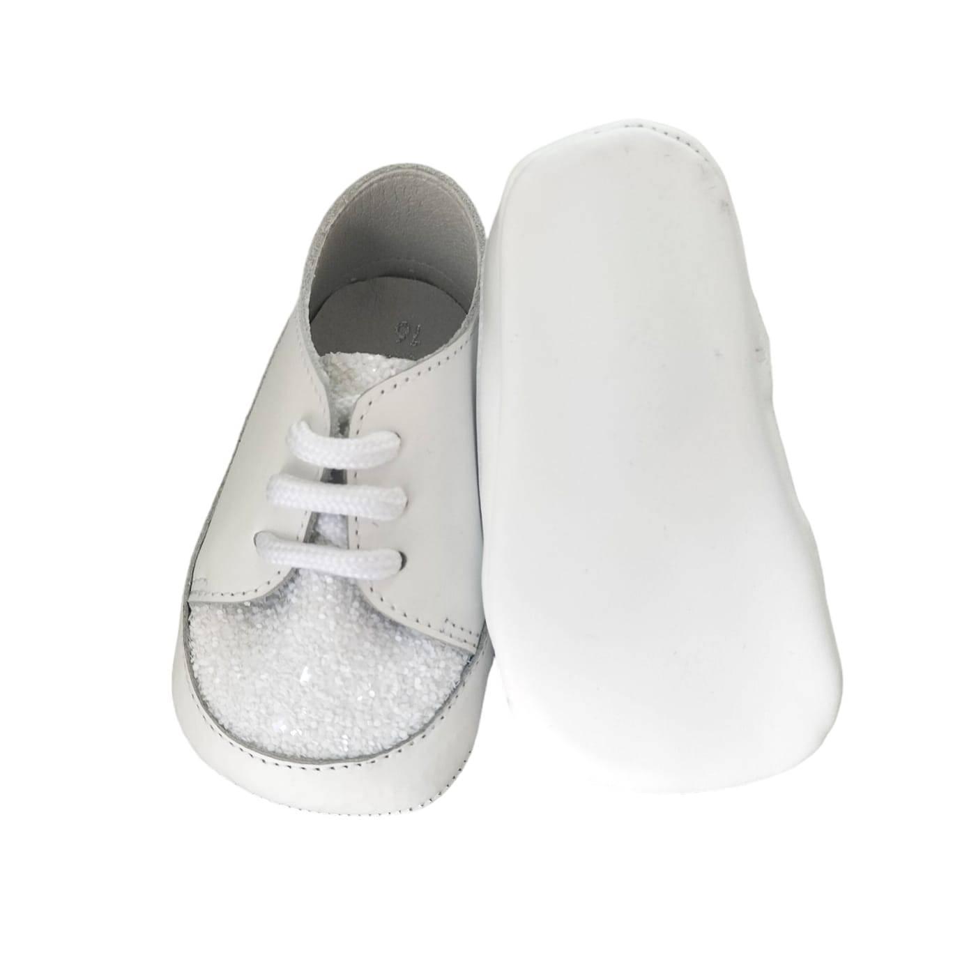 Weiche Wiegeturnschuhe aus weißem Leder für Mädchen, Schnürsenkel und Ton-in-Ton-Glitzer-Detail.