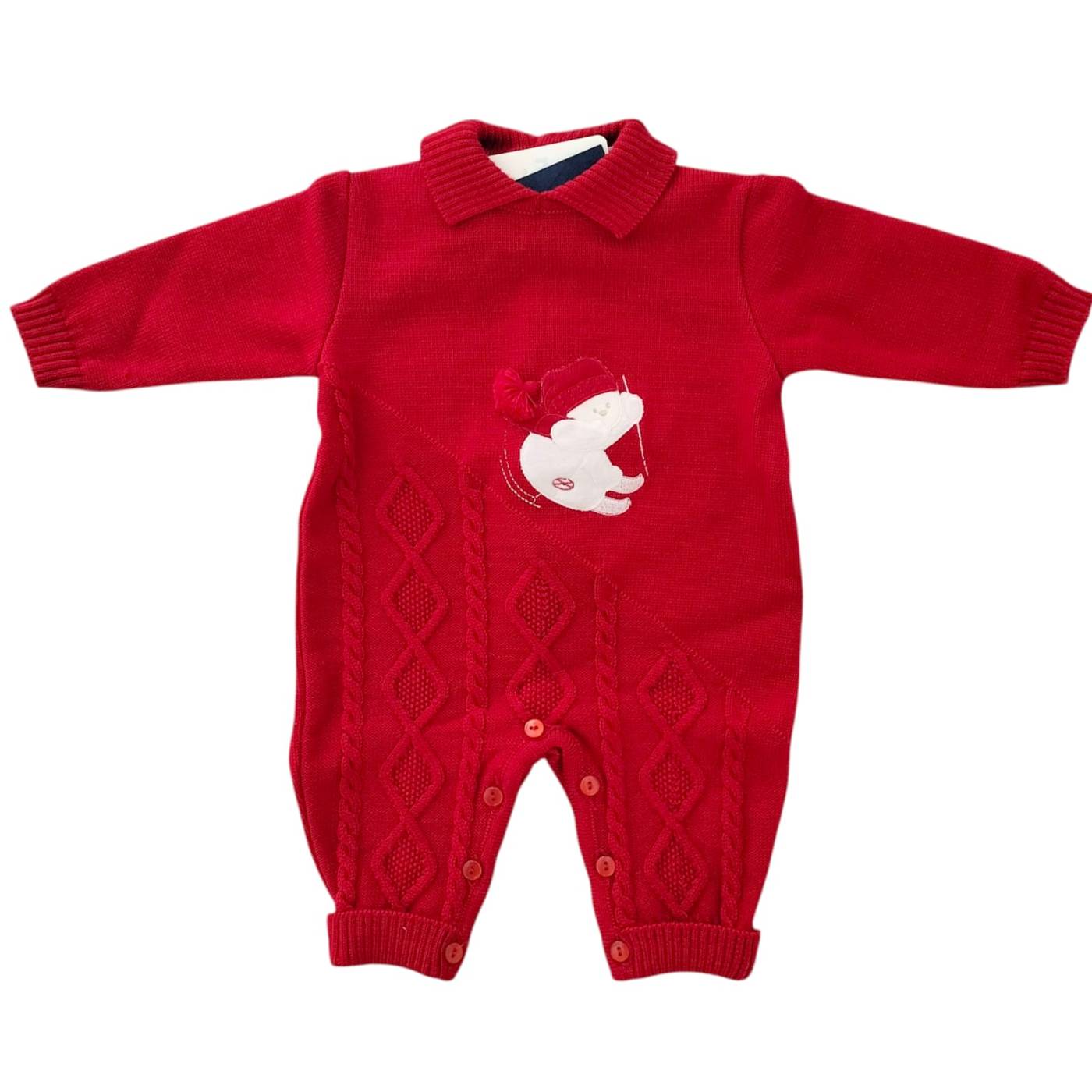 Es ist aus reiner Wolle mit rotem Hintergrund gefertigt und hat einen kontrastierenden cremefarbenen Teddybär auf dem Mieder. Ideal für ihr erstes Weihnachten.