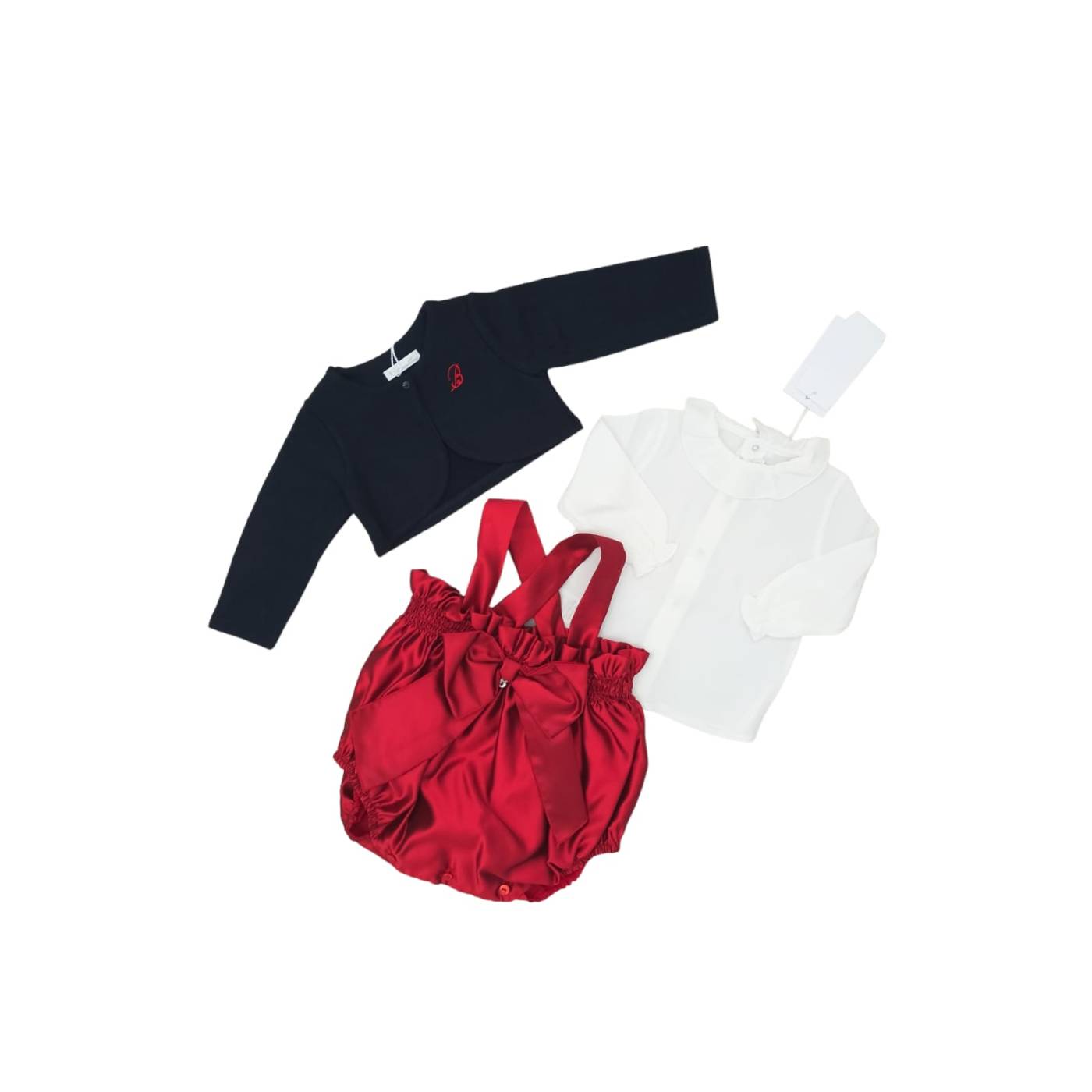Wenn Sie auf der Suche nach einem Outfit für die kälteren Jahreszeiten oder für die Weihnachtszeit sind, ist dieses 3-teilige Outfit der Marke Barcellino die richtige Wahl für Sie. Es besteht aus einem milchig-weißen Hemd aus einer Seidenmischung, einem Schal (oder Herzwärmer) aus warmer blauer Baumwolle mit einem kontrastierenden roten gestickten "B" oben links, dem Markenzeichen der Marke, und einer hochtaillierten roten Shantung-Seidenhose mit Hosenträgern. Diese Hose hat oben an der Taille ein Wabenmuster, das an die Verarbeitung von früher erinnert, und eine Schleife aus demselben Stoff mit einem strassbesetzten "B" in der Mitte, dem Logo der Marke; eine Öffnung im Schritt mit Knöpfen, um das Anlegen und das Wechseln der Windel zu erleichtern. Es wird empfohlen, ihn mit einer Strumpfhose zu tragen.
