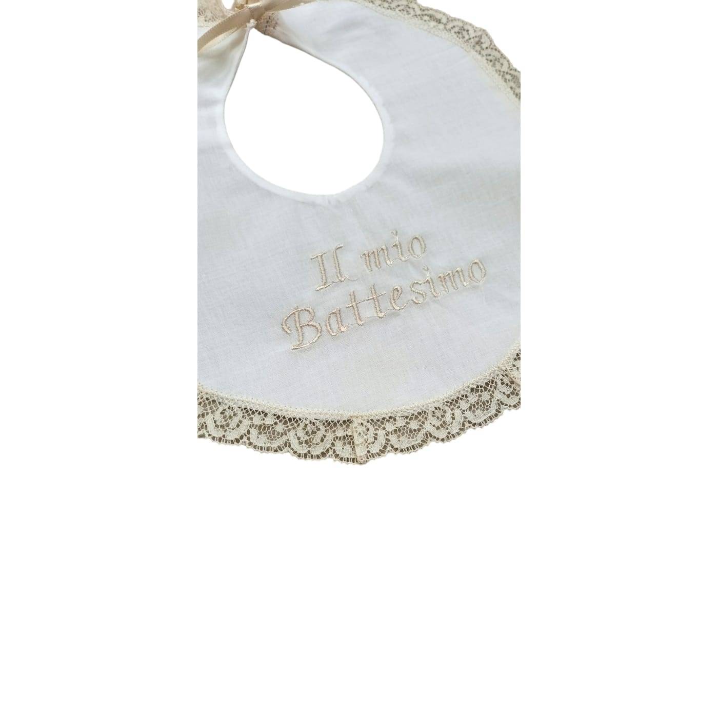 Babero con bordado a máquina ''Mi bautizo'' realizado en fino algodón blanco leche y bordados y puntillas de color marfil. Un recuerdo de un día importante que permanecerá con su bebé.