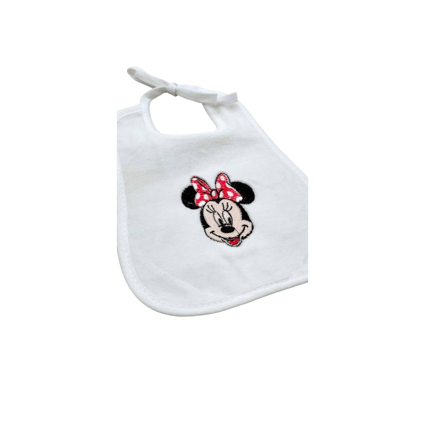 Simpático babero para bebé niña realizado sobre una base blanca con bordado central de Minnie. Se sujeta con cordones.