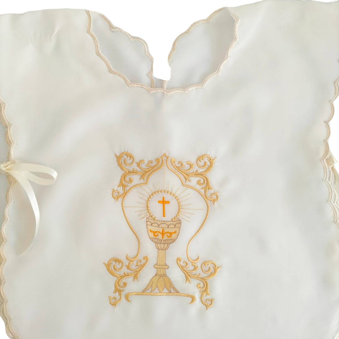 Blusa de bautismo confeccionada en mezcla de seda de color crema claro, redefinida con festón tono sobre tono y bordado central dorado que representa la pila bautismal.