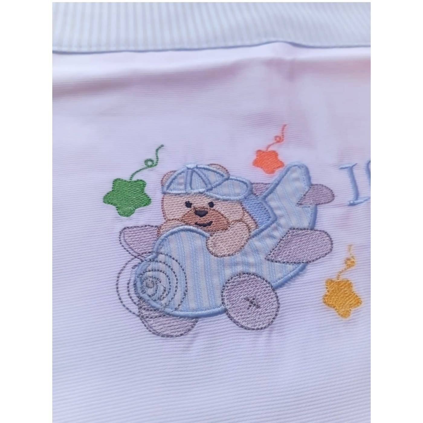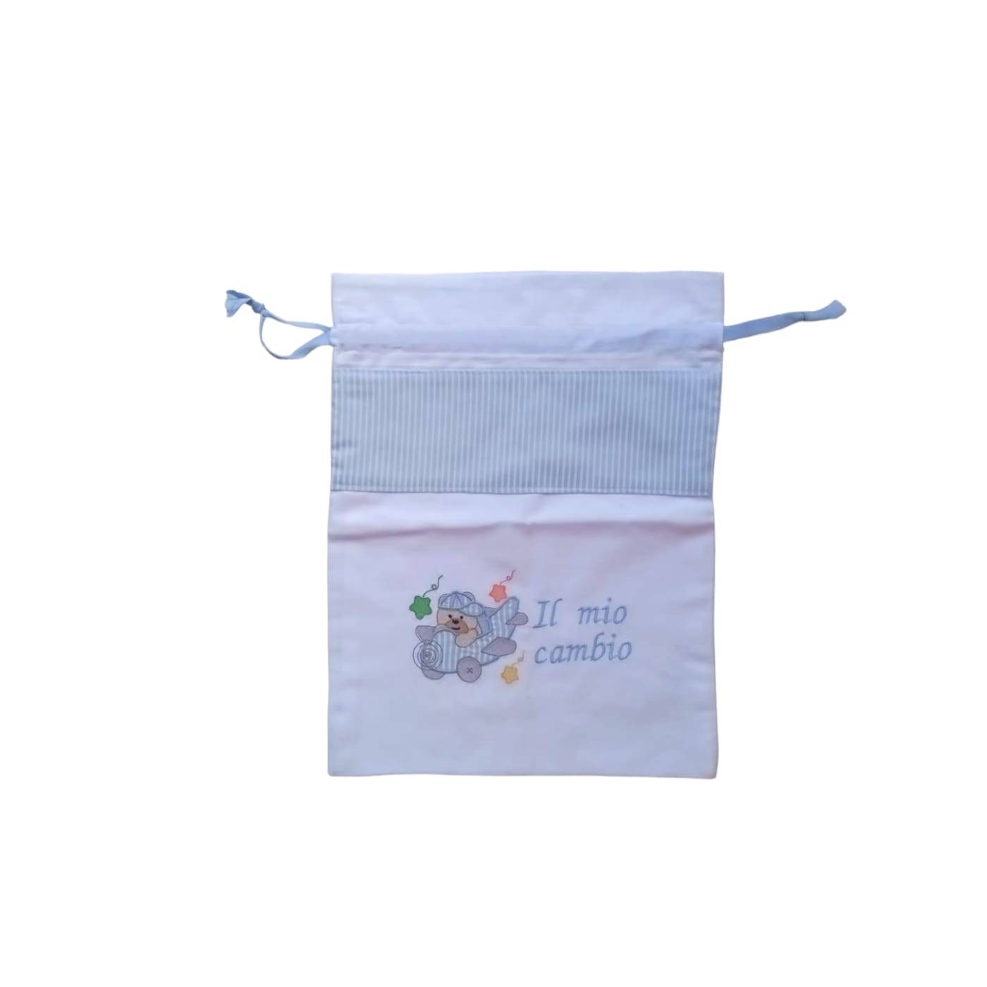 Bolso cambiador confeccionado en milrayas de algodón blanco y celeste, este último tejido se encuentra tanto en la parte superior como en los apliques bordados en el avión y en el gorro del osito, el diseño va acompañado de las palabras: "Mi muda".