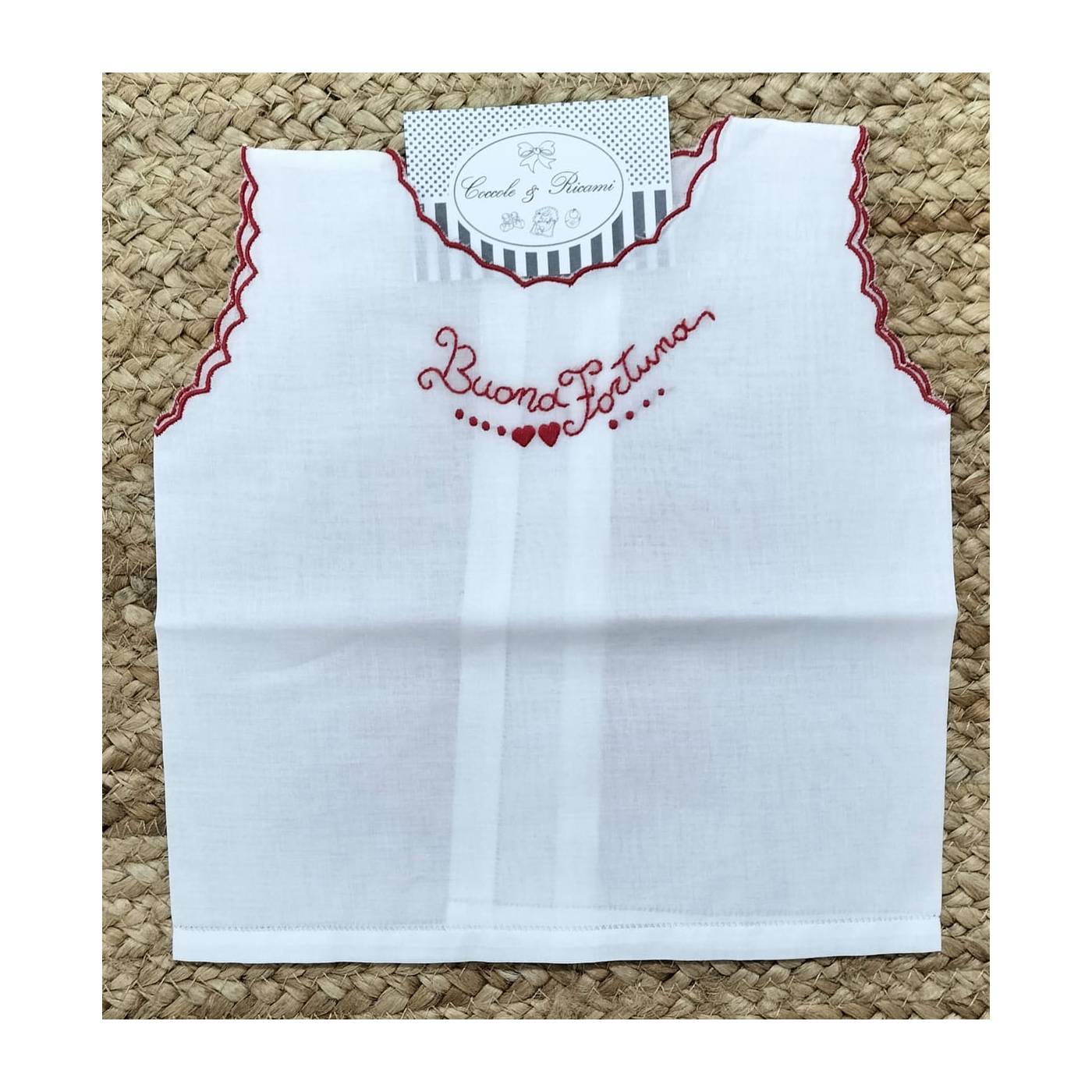 Confeccionada sobre una base de algodón puro 100% en color blanco y bordada a mano en rojo con la inscripción: "Buena suerte".