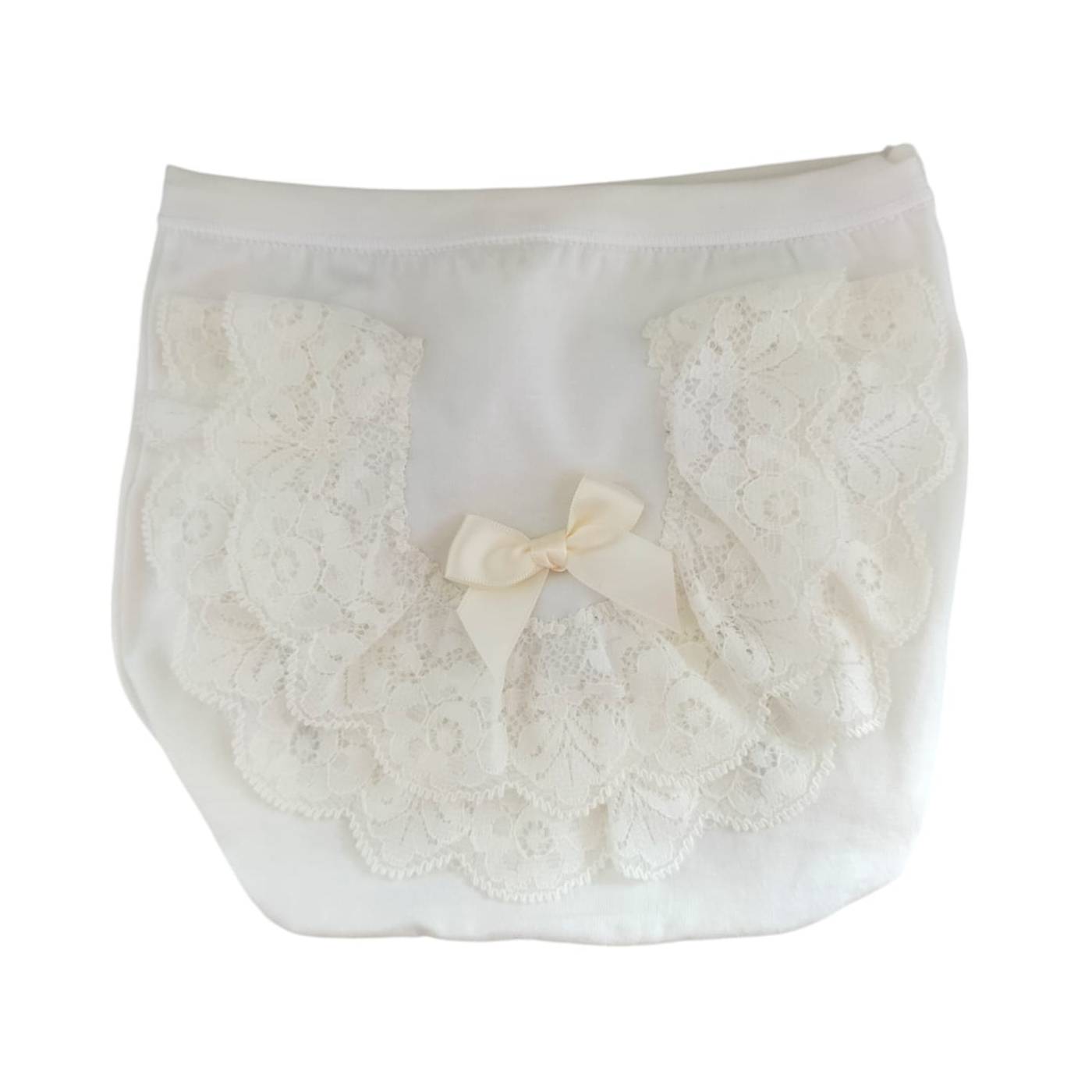 Un coulotte de bebé niña 100% algodón blanco enriquecido con encaje en la espalda. Este coulotte completará el look elegante de su niña en las ocasiones especiales.