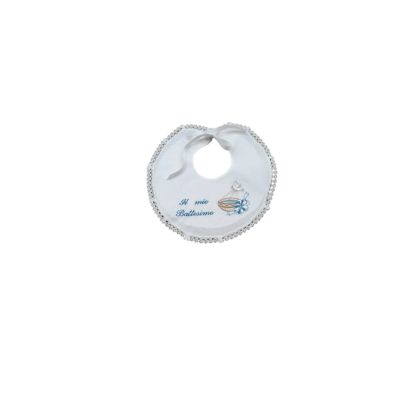 Los accesorios indispensables para el día del bautizo de tu bebé son el babero y el pañuelo. Confeccionados sobre una base de algodón blanco, llevan bordadas la pila bautismal y la paloma, acompañadas de un nudo lateral blanco y azul.