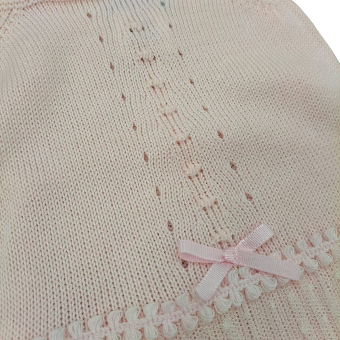 Conjunto de hilo de algodón rosa compuesto por una camisola de tirantes con tul crema en el extremo y un coulottes (cubrepañal) de color liso. Ideal para el verano.