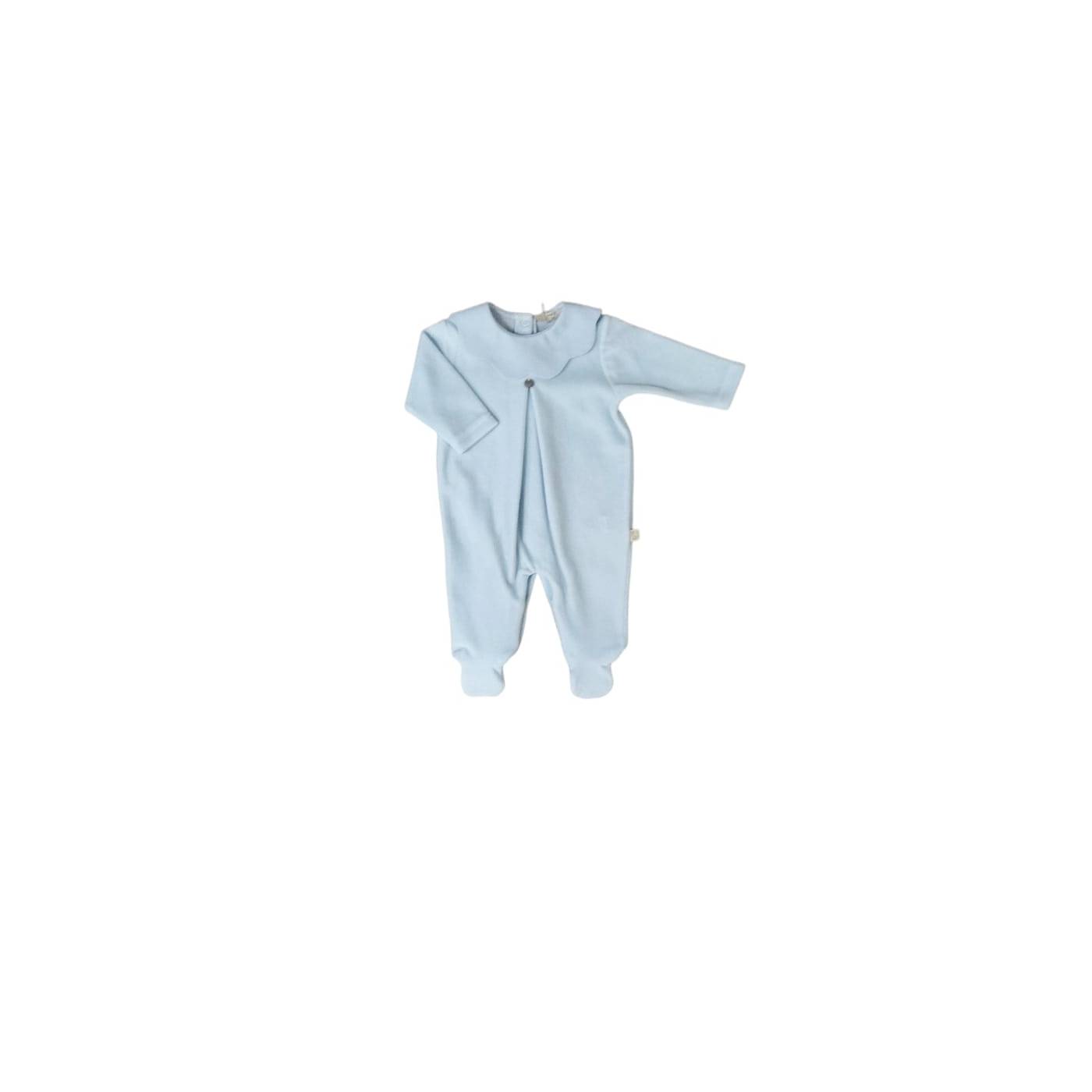 Pelele para recién nacido de la marca Baby gi confeccionado en chenilla azul claro muy suave. El diseño lineal y los tejidos de calidad caracterizan estos pijamas. La particularidad de este pijama es el cuello de piqué de algodón tono sobre tono redefinido en arcos. Como la chenilla es un tejido muy versátil, es adecuado tanto para los periodos más fríos como para principios de primavera.