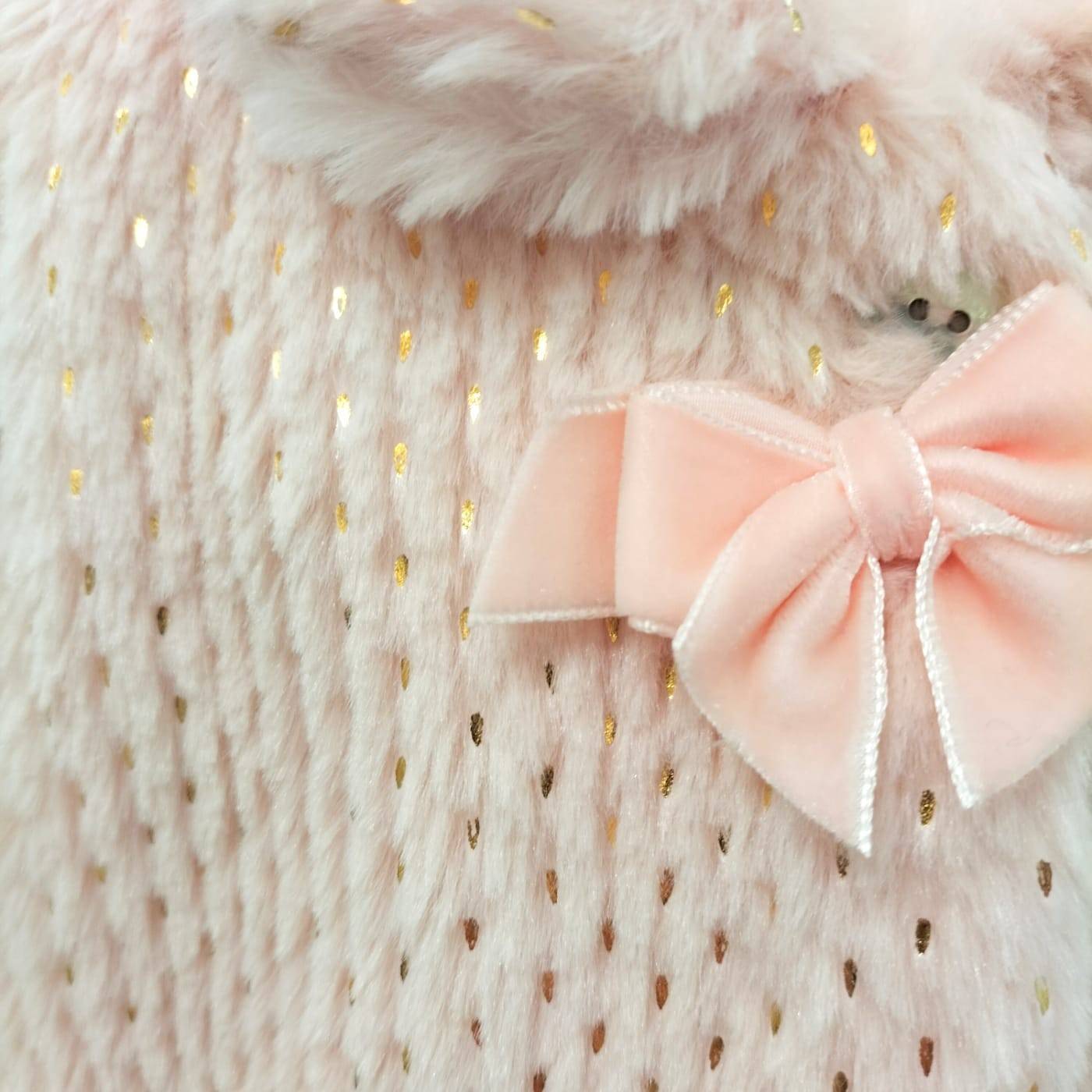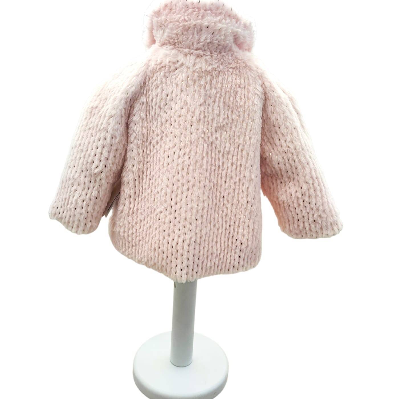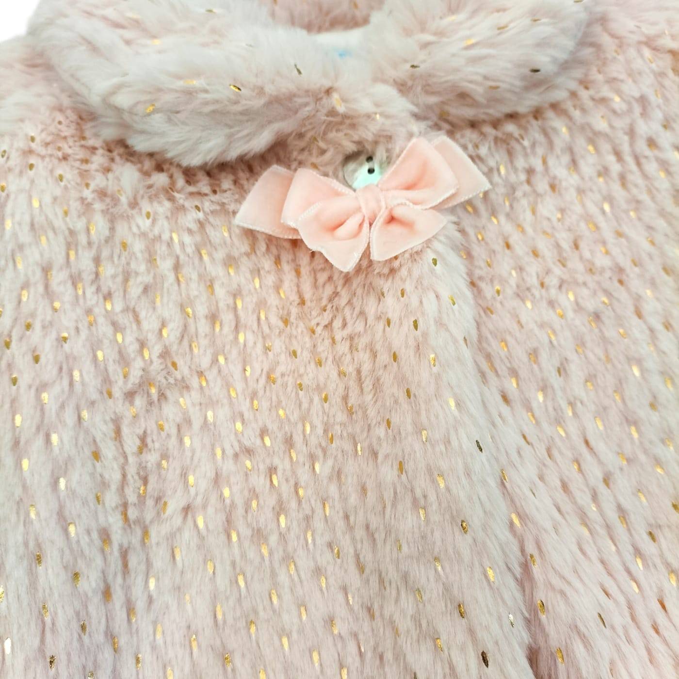 Suave prenda exterior de niña de piel sintética rosa con pequeños lunares dorados que añaden brillo a la prenda. Combina fácilmente con vestidos elegantes pero también con looks informales. Con esta prenda, tu niña estará arropada y calentita sin renunciar a la comodidad y la elegancia. Cierre con botones bajo el cuello.