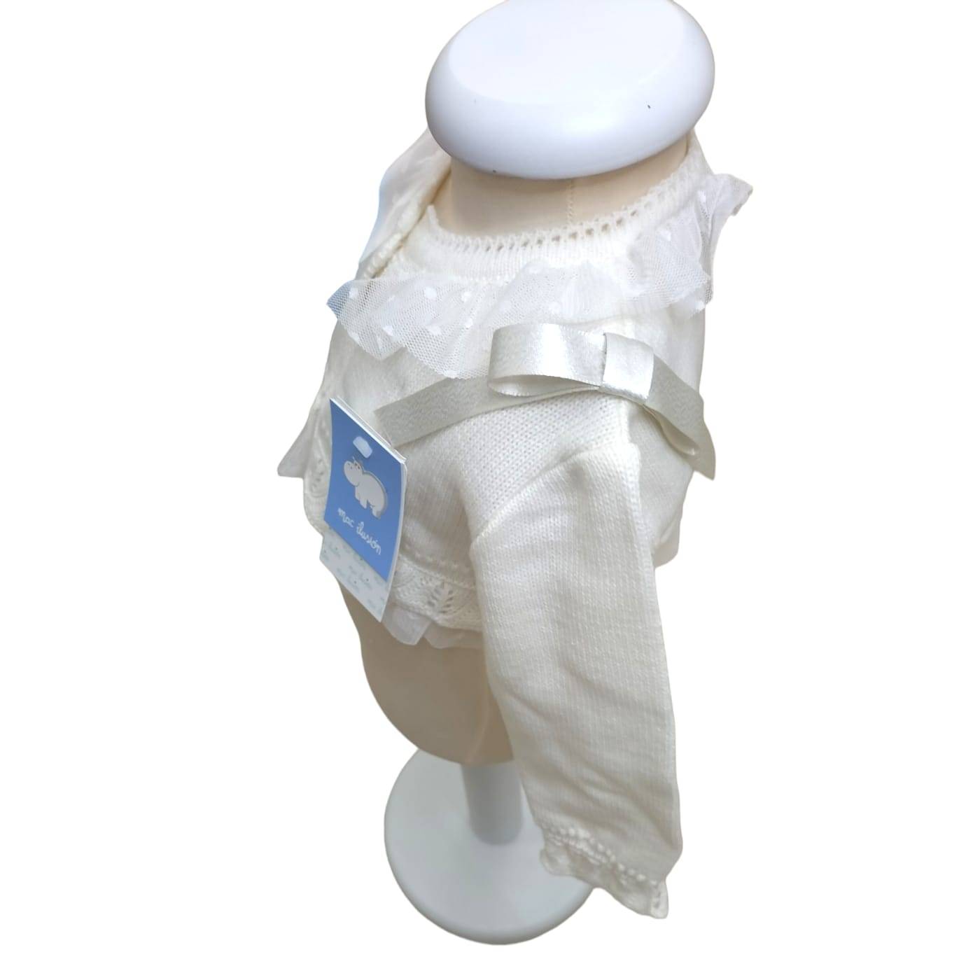 Elegante cubrepañal en mezcla de lana de color crema con punto clásico. La particularidad de esta chaqueta para recién nacida es el ribete de tul con pequeños lunares tono sobre tono, igual que alrededor del cuello, y dos lazos laterales de raso de seda que hacen que la prenda sea aún más elegante.