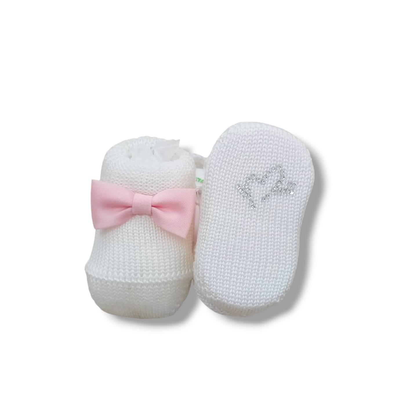 Suave botín de la marca Minù. Realizado en hilo de algodón color crema claro con lazo rosa a contraste y logotipo de la marca realizado en pedrería en la parte inferior. Adecuado desde los primeros días de vida del bebé y fácilmente adaptable. Un diseño sencillo pero cuidado al detalle.
