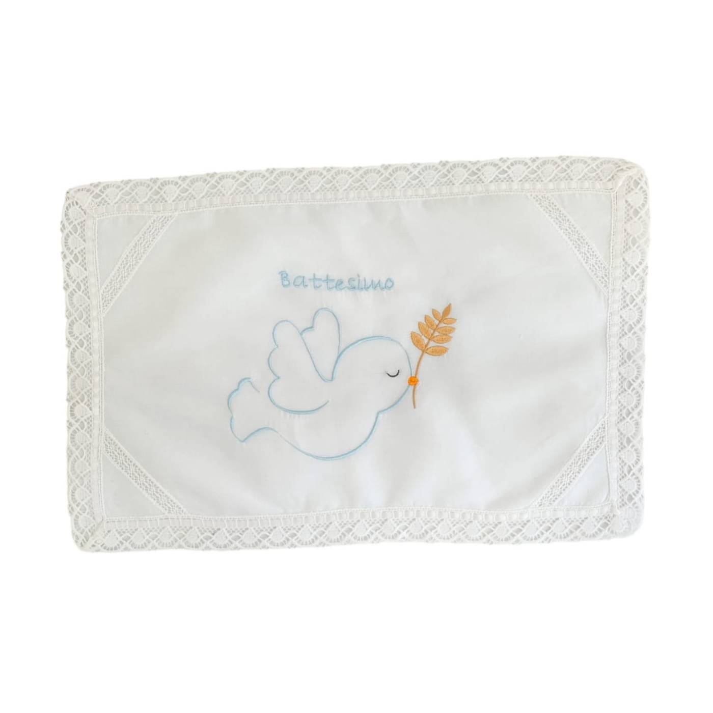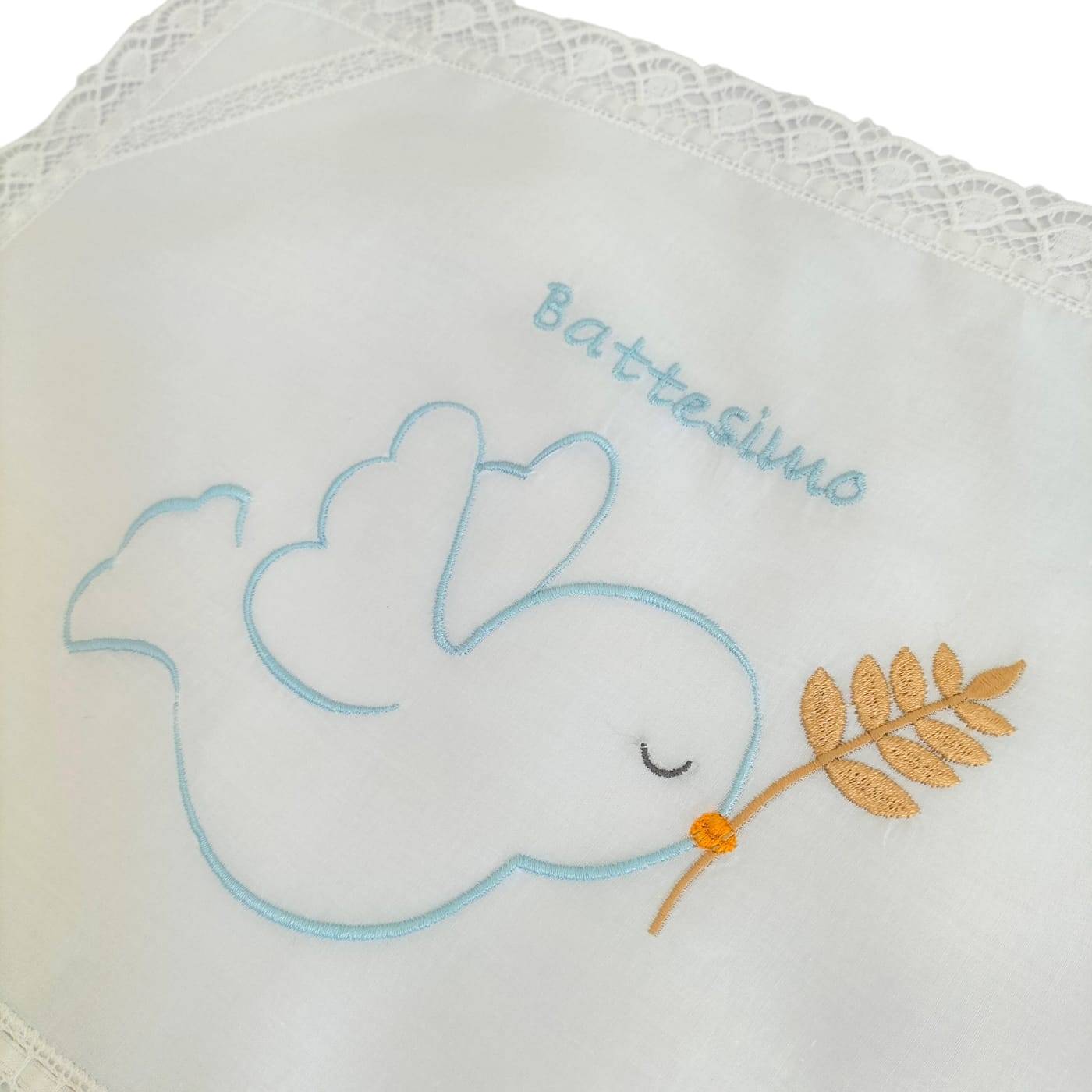 Mouchoir de baptême en coton doux sur fond blanc redéfini par une petite dentelle de coton ton sur ton et une broderie bleu clair "Baptême" et colombe avec brindille.