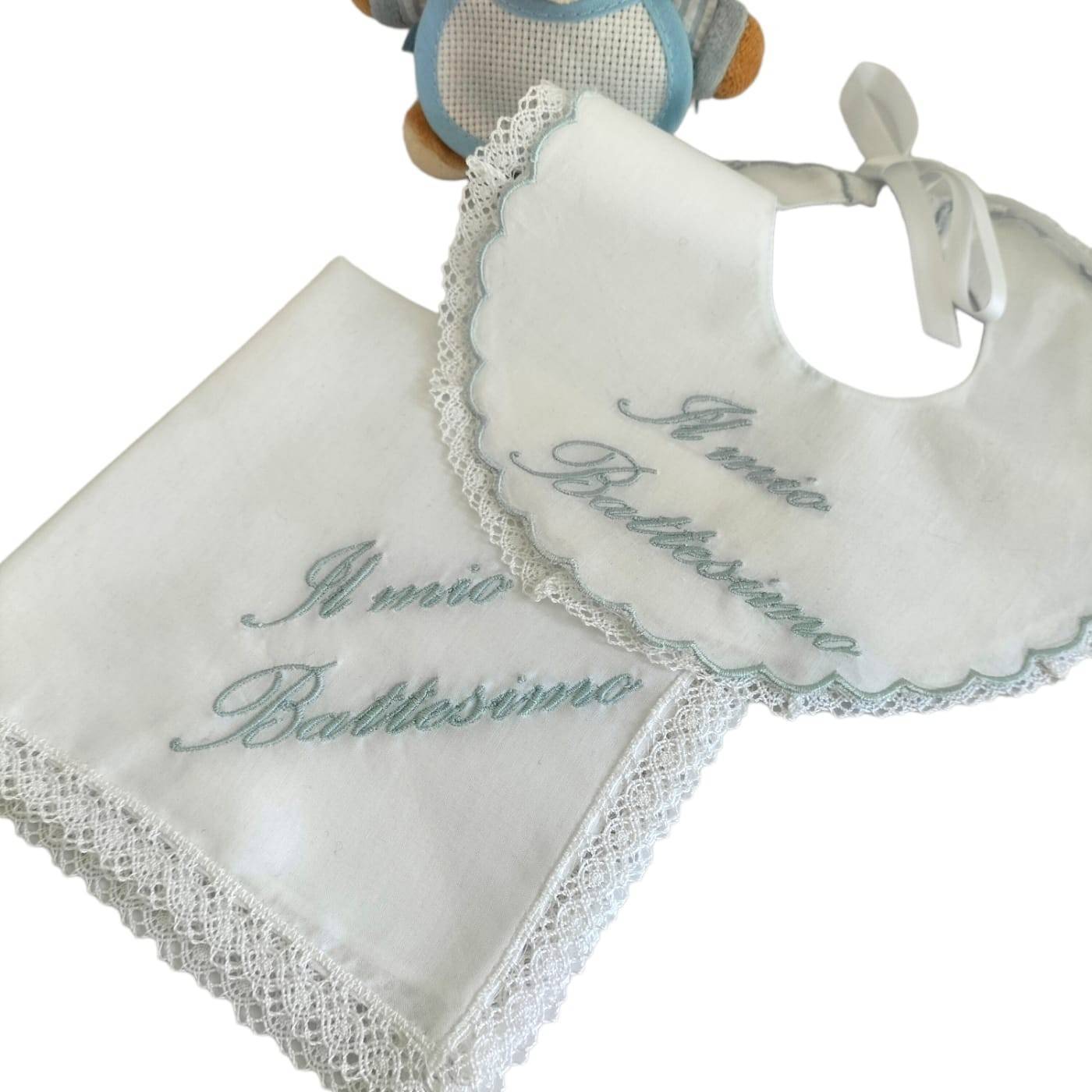 Pour le jour du baptême de votre bébé, vous pouvez compléter le look de votre bébé de la meilleure façon possible si vous êtes une maman qui a le souci du détail ; en effet, le bavoir et le mouchoir de baptême sont incontournables. Base blanche et broderie bleu clair avec les mots : "Mon baptême", le tout redéfini par un petit lacet de coton blanc.
