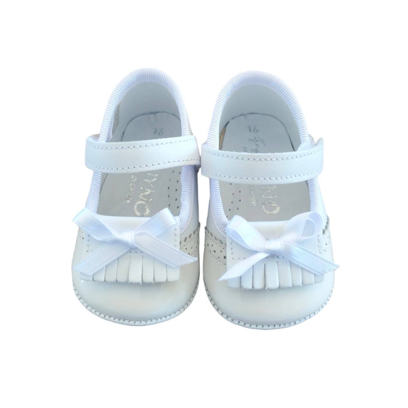 Pantoufles en cuir blanc souple avec détails en cuir verni, convenant également pour le baptême.