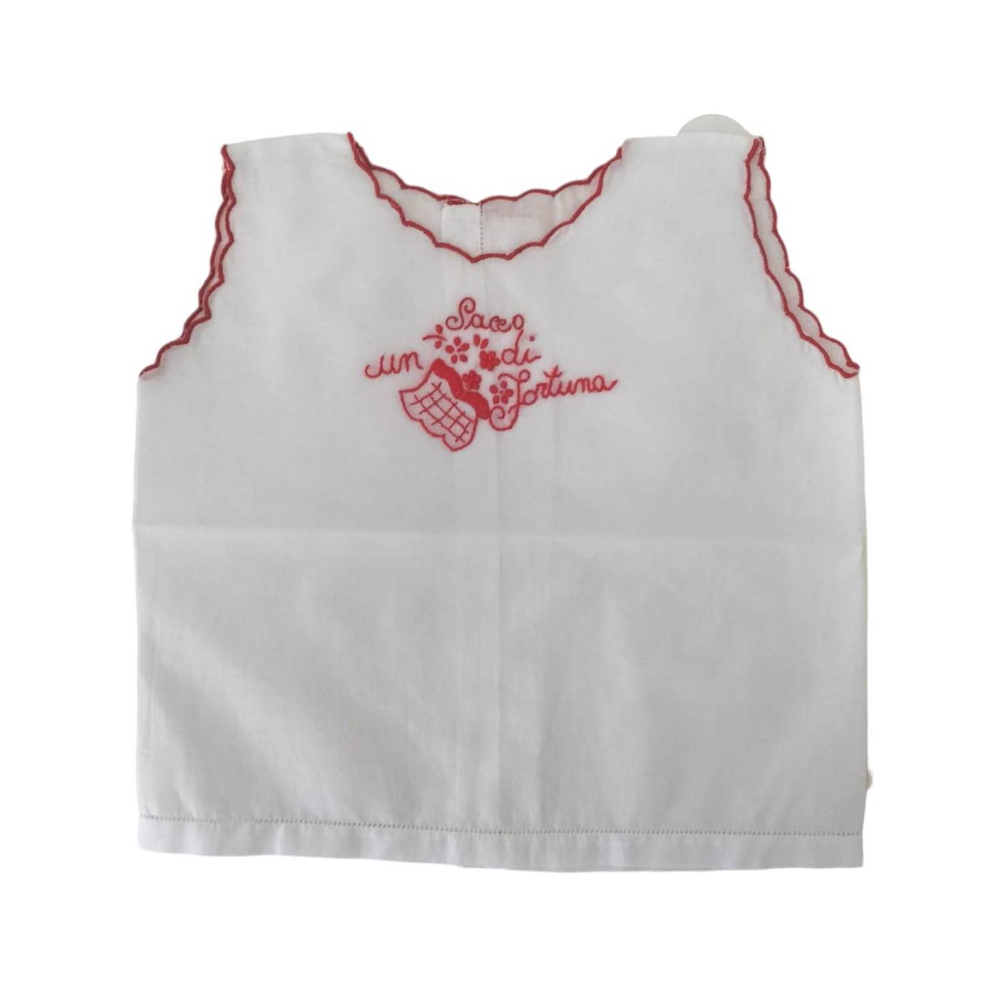 Réalisée sur une base 100% pur coton en blanc et brodée à la main en rouge avec l'inscription : "Good Luck".