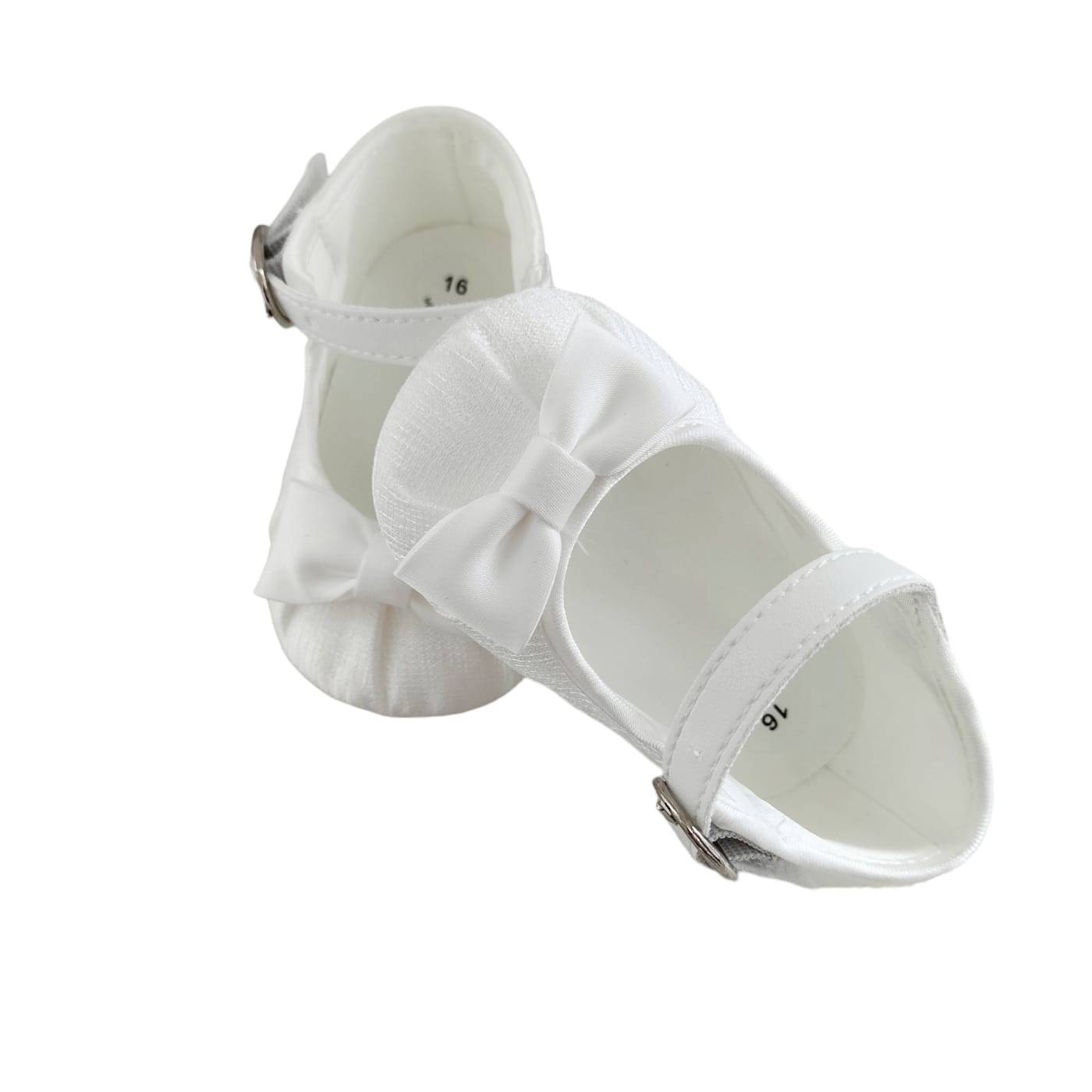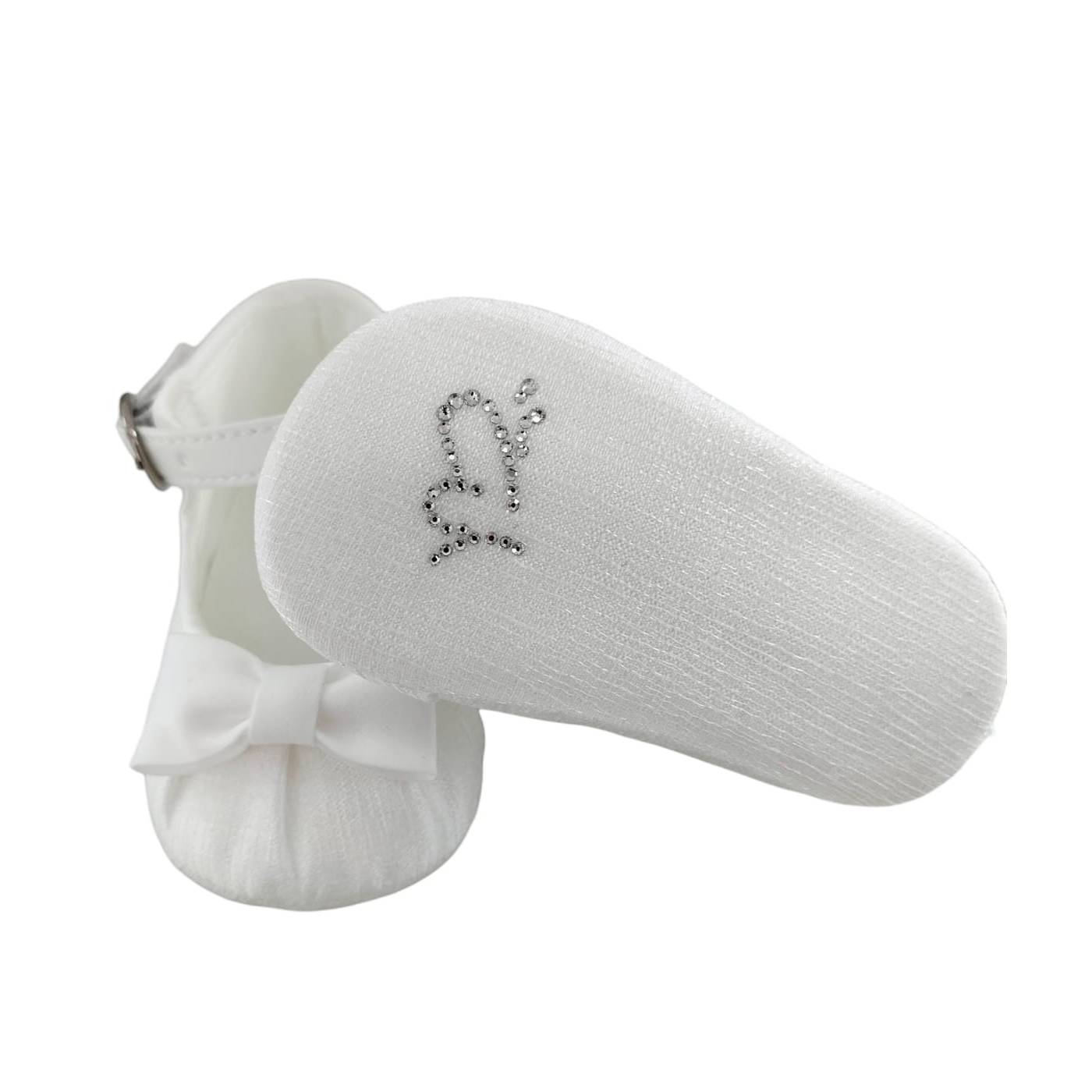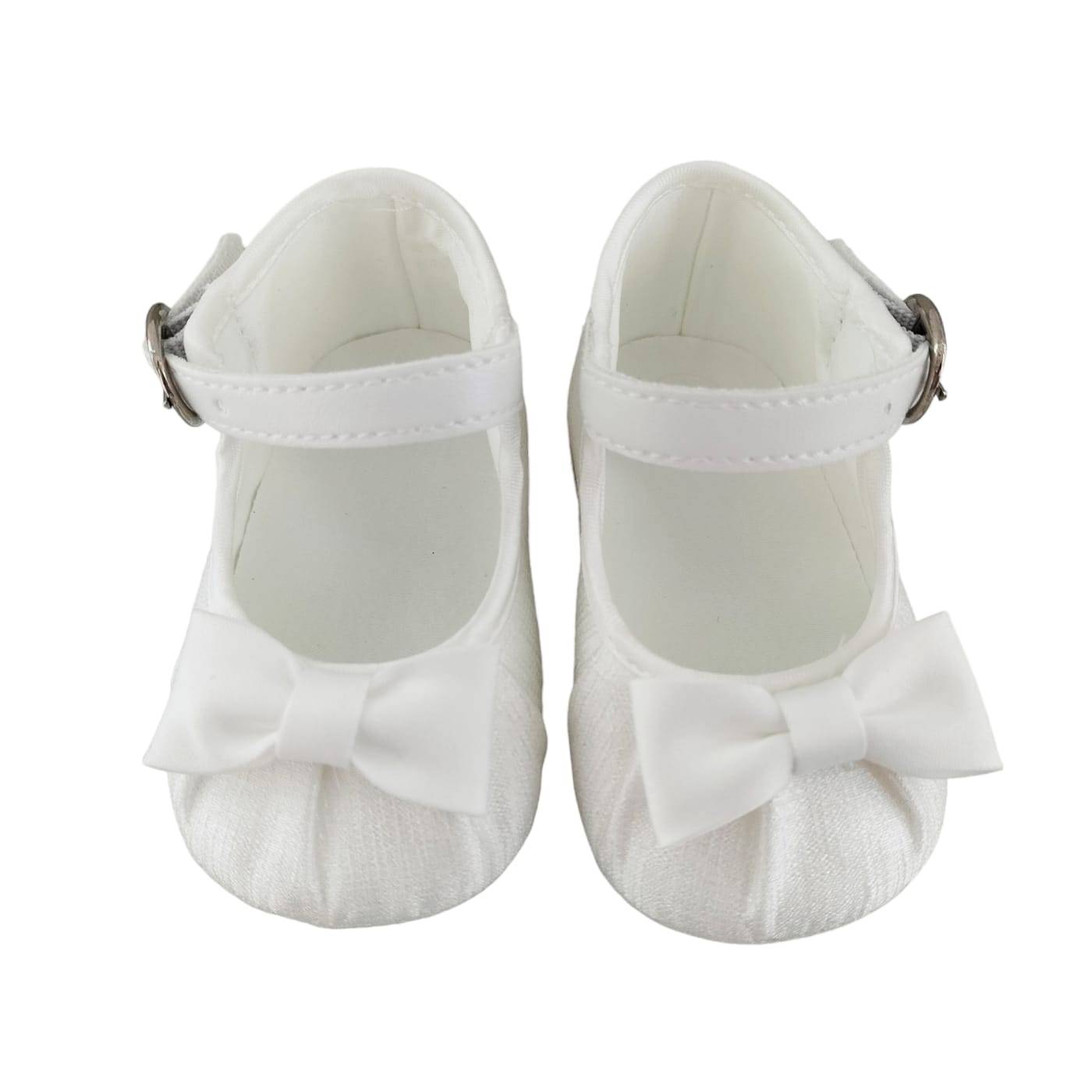 Élégants souliers de berceau souples en shantung de soie blanc, convenant à un baptême ou à une cérémonie.