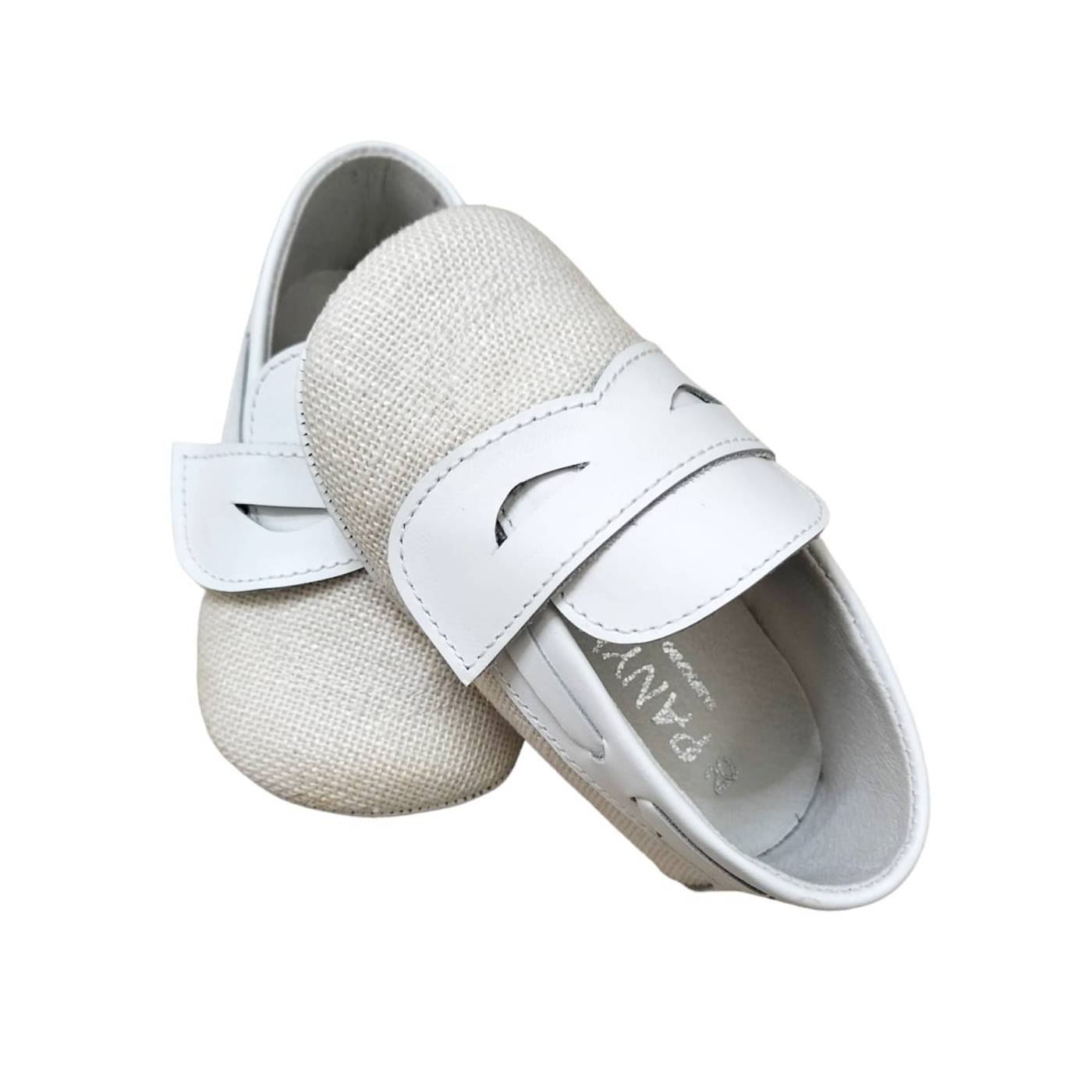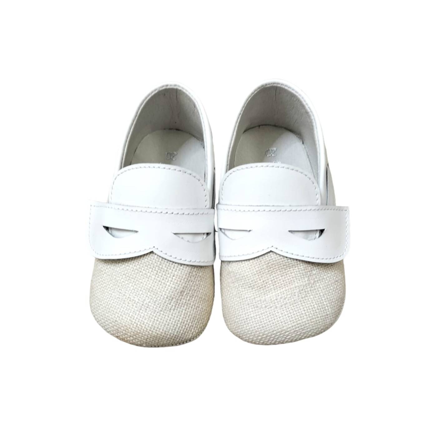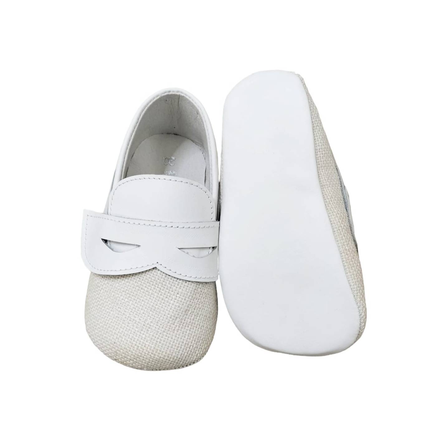 Chaussures berceau pour nouveau-né, de type mocassin, en cuir blanc bicolore et tissu effet lin de couleur crème.