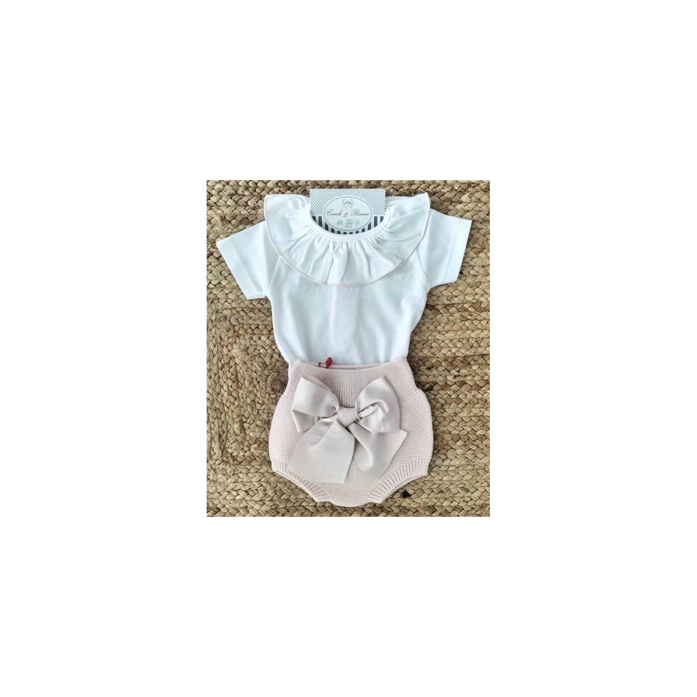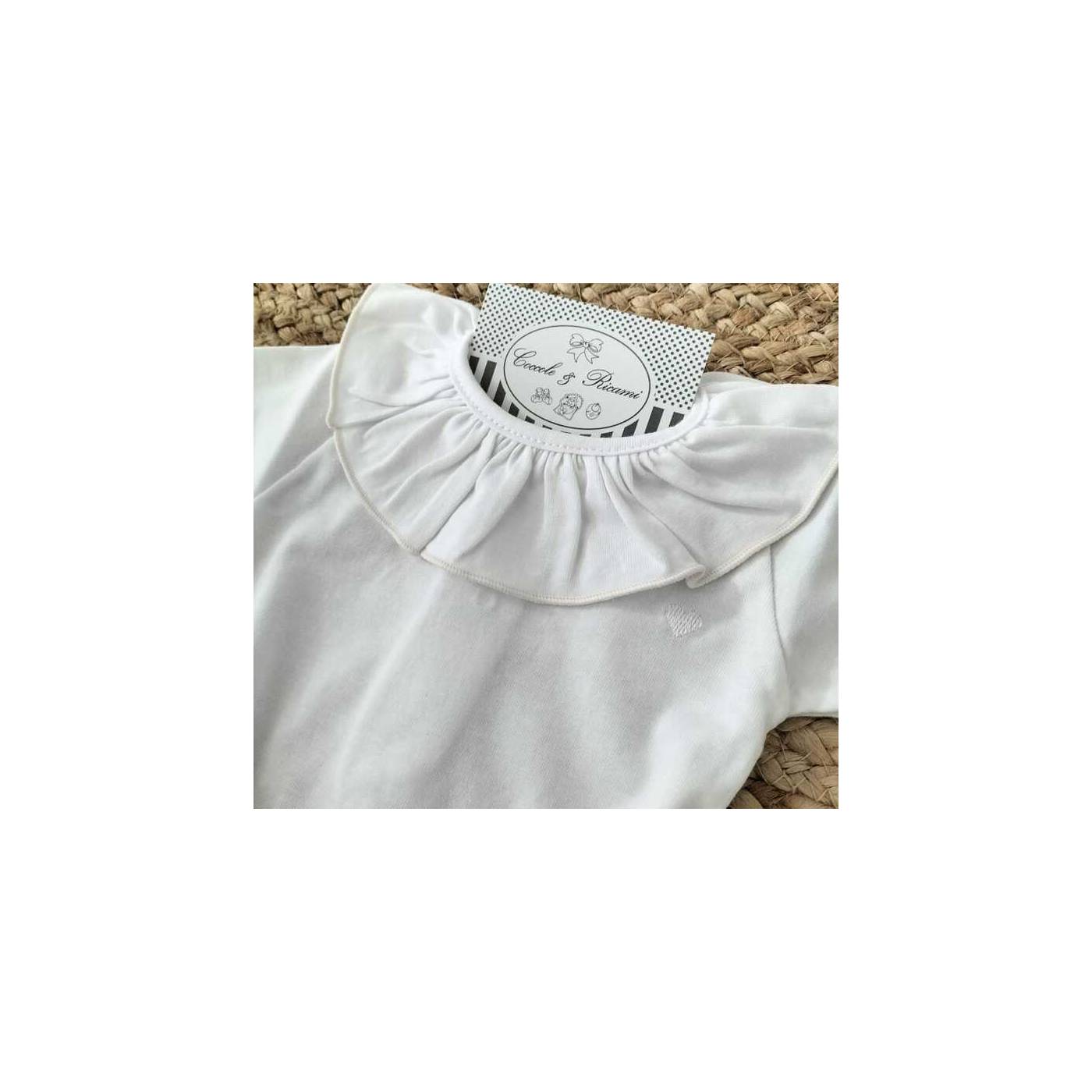 Body pour fille en coton blanc avec encolure festonnée de couleur nude.
