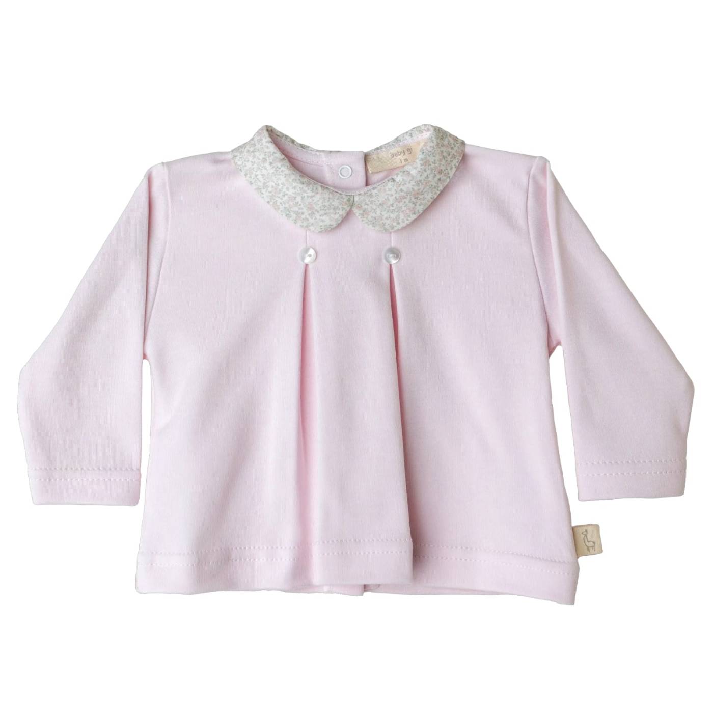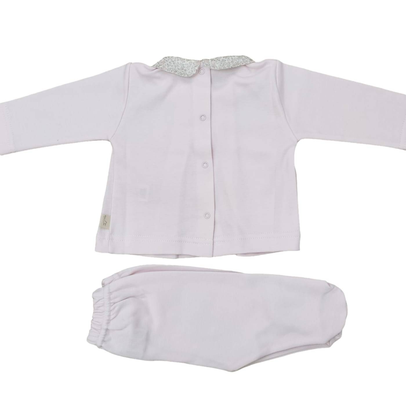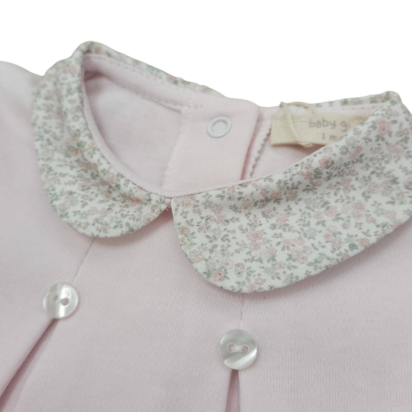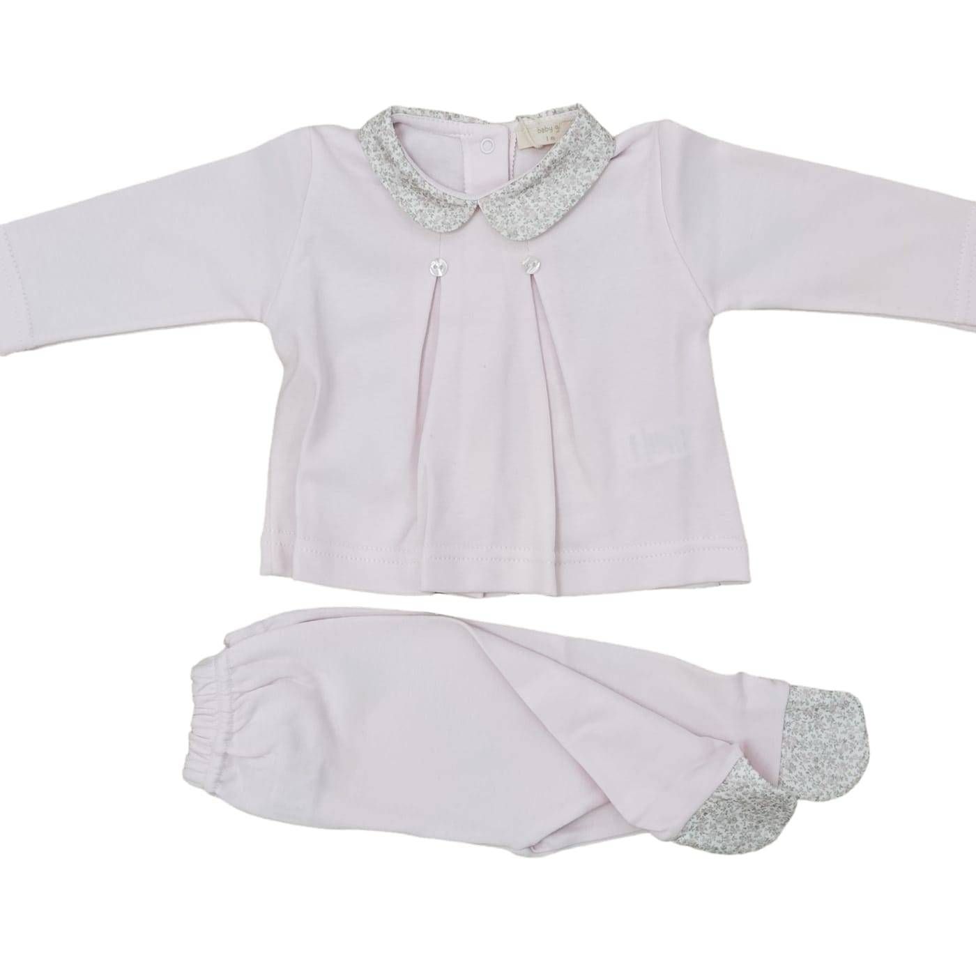 Charmant ensemble pour nouveau-né de la marque Baby gi en jersey de coton rose avec des détails en tissu de coton au délicat motif floral.