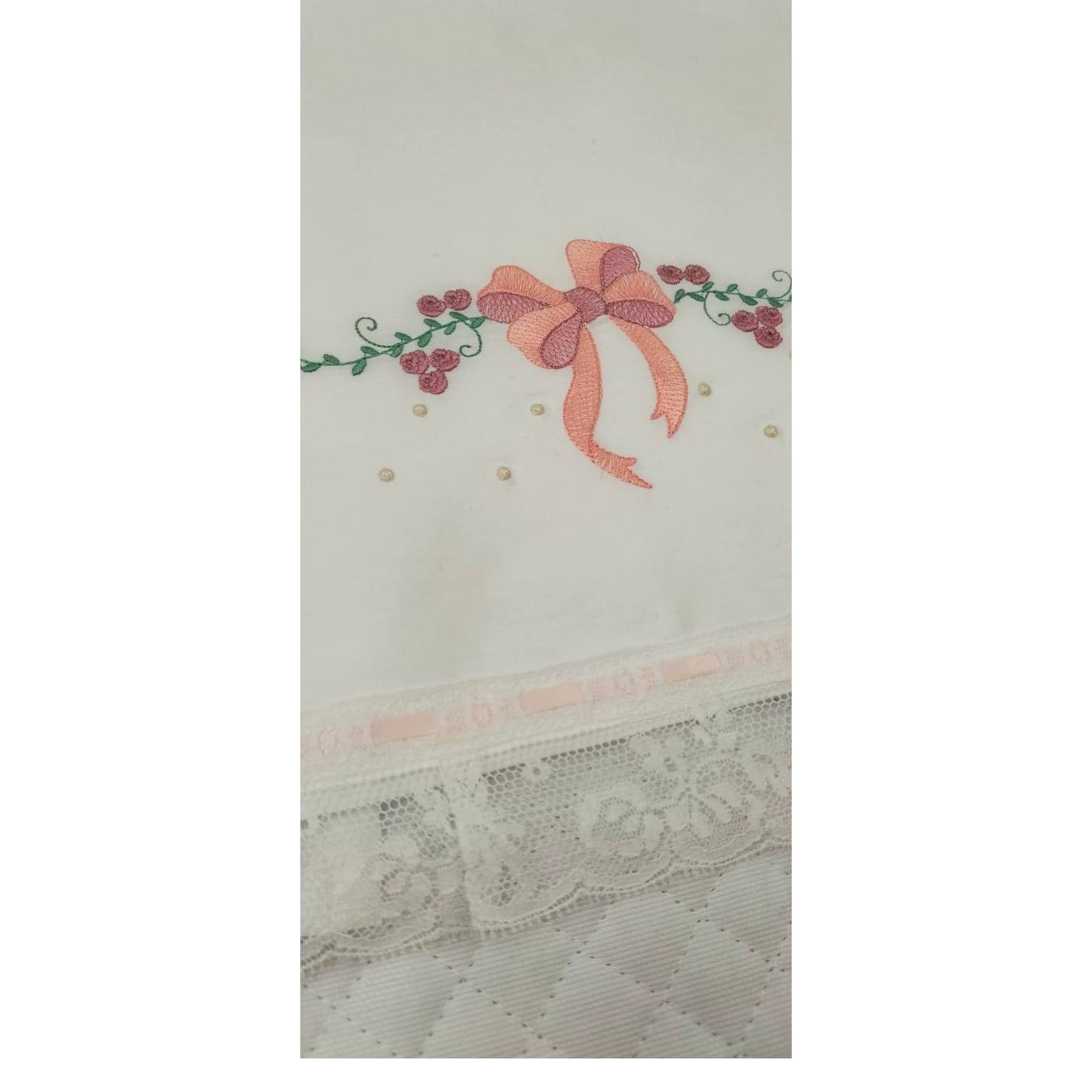 Elégant drap pour nouveau-né, brodé à la machine sur une fine mousseline de coton blanc, mettant en valeur le "nœud d'amour". Retravaillé avec une élégante dentelle blanche et un ruban rose. Convient au lit d'hôpital, à la nacelle et au nex to me. Ensemble de 3 pièces avec taie d'oreiller et dessous avec coins.
