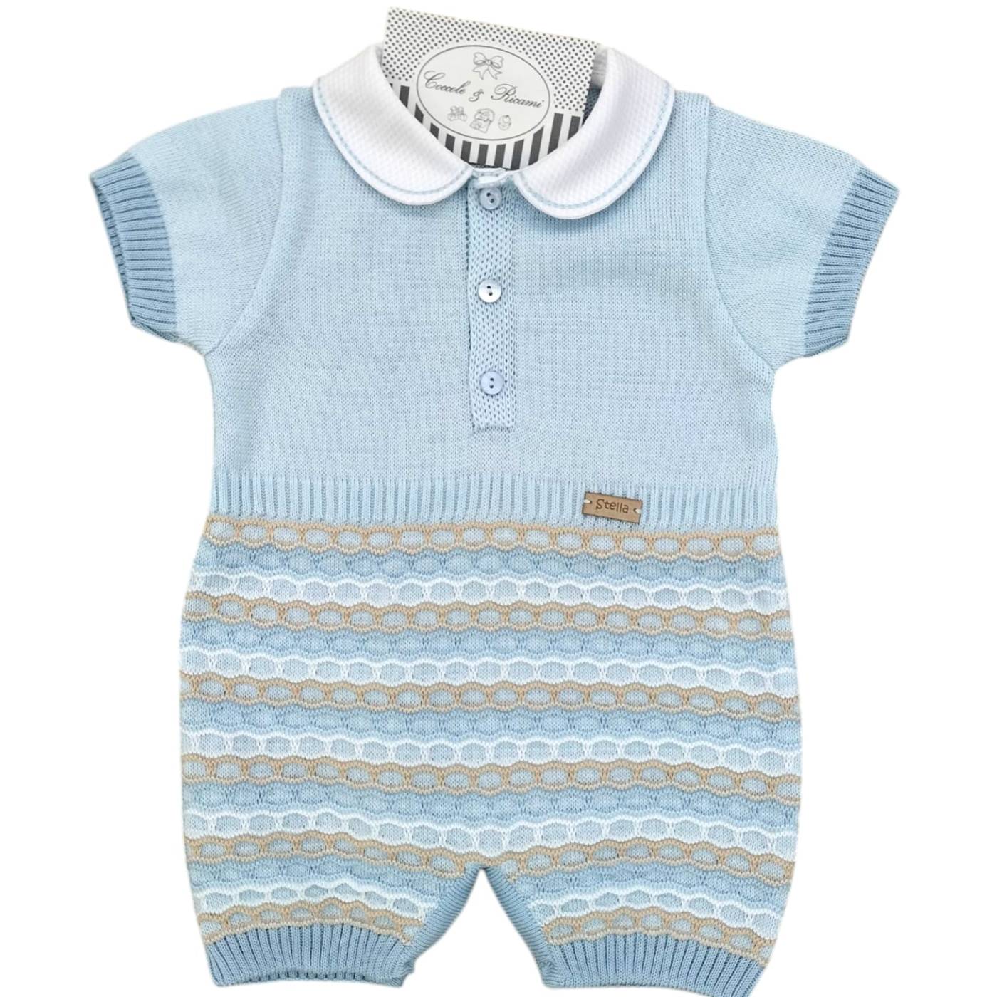 Grenouillère pour bébé en fil de coton avec motif en nid d'abeille en bleu clair, blanc et gris tourterelle. Convient pour les naissances au milieu de l'été.