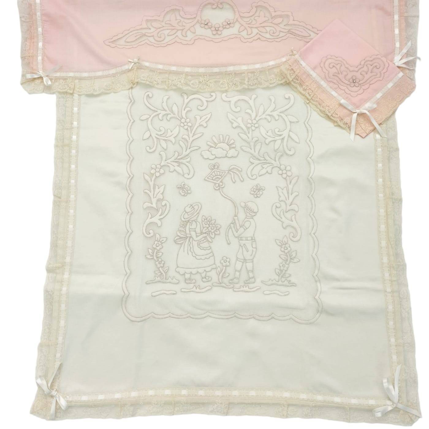 La même technique est appliquée sur le drap en mousseline de coton rose, où les broderies sont agrémentées de strass qui donnent de l'éclat et terminées par une fine dentelle.