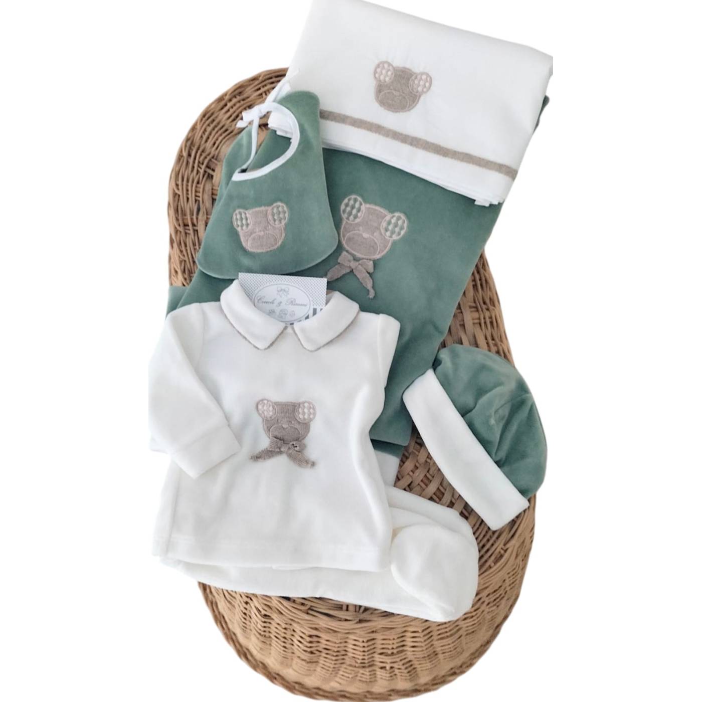Ensemble de literie 'Baby Margo' en chenille douce dans les couleurs neutres vert sauge, crème et gris tourterelle.