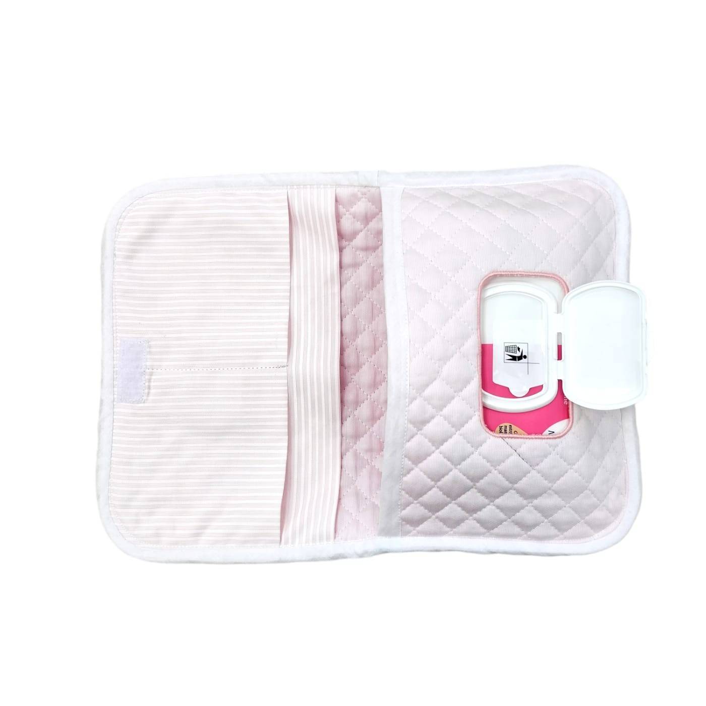Porte-serviettes et porte-couches pratique, en coton matelassé rose bordé de blanc, orné d'un nounours rayé rose et blanc.