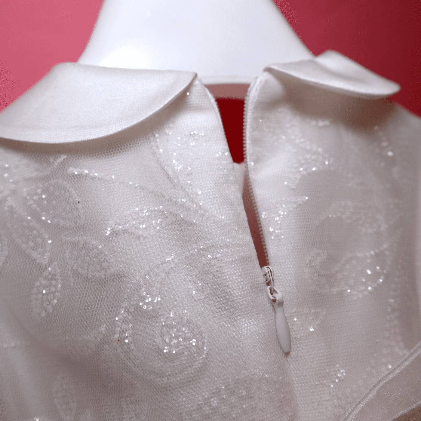 Robe de fille convenant aussi bien à une cérémonie qu'à un baptême. De couleur blanc laiteux, la particularité de ce vêtement réside dans le tissu qui, avec un effet pailleté toujours ton sur ton, forme le dessin de la robe. Le col est en satin simple, la robe a des demi-manches avec des manches en tulle qui créent un effet de transparence sur les bras de l'enfant. À la taille, on trouve une fausse bretelle en satin avec un nœud au centre détaillé par un pompon en fourrure.