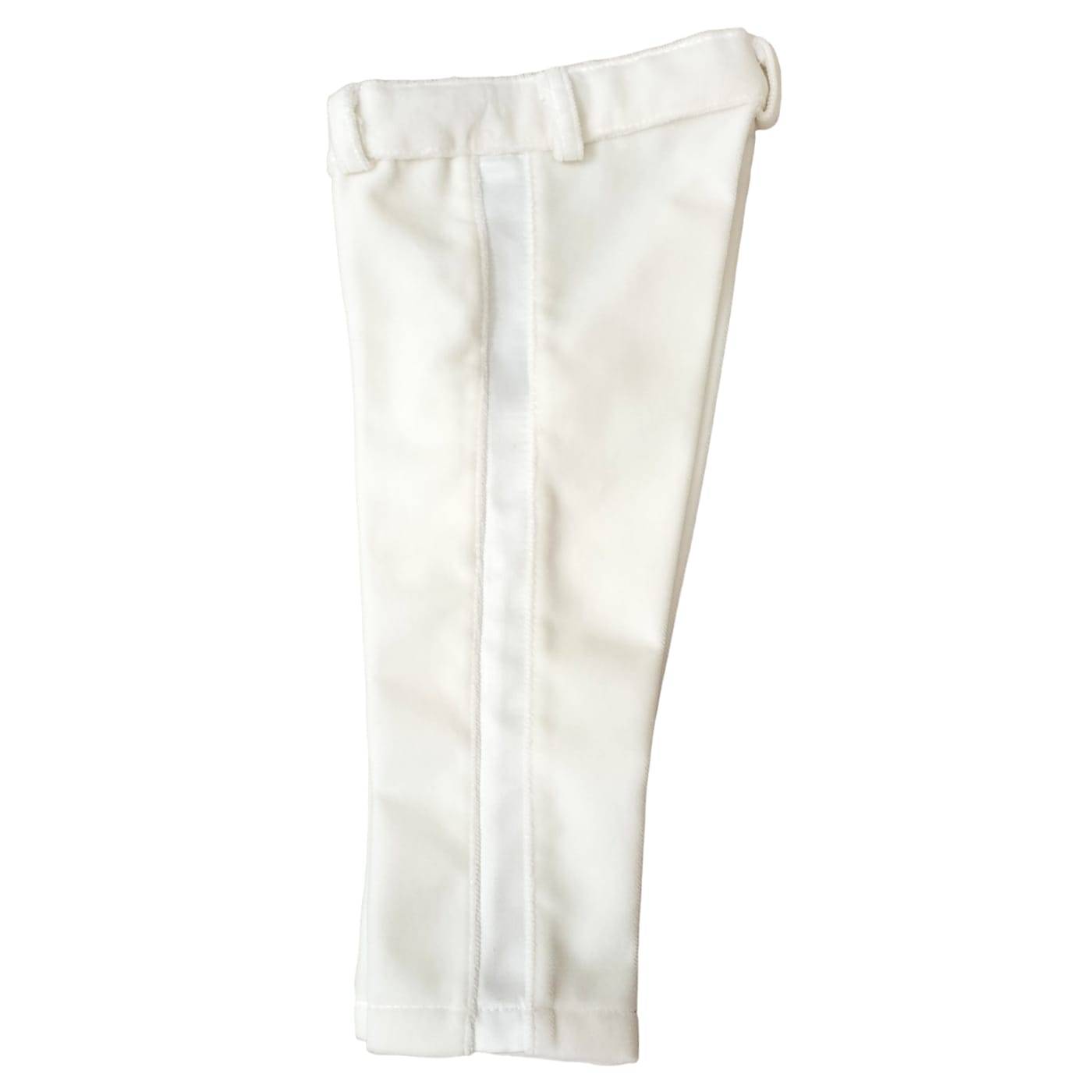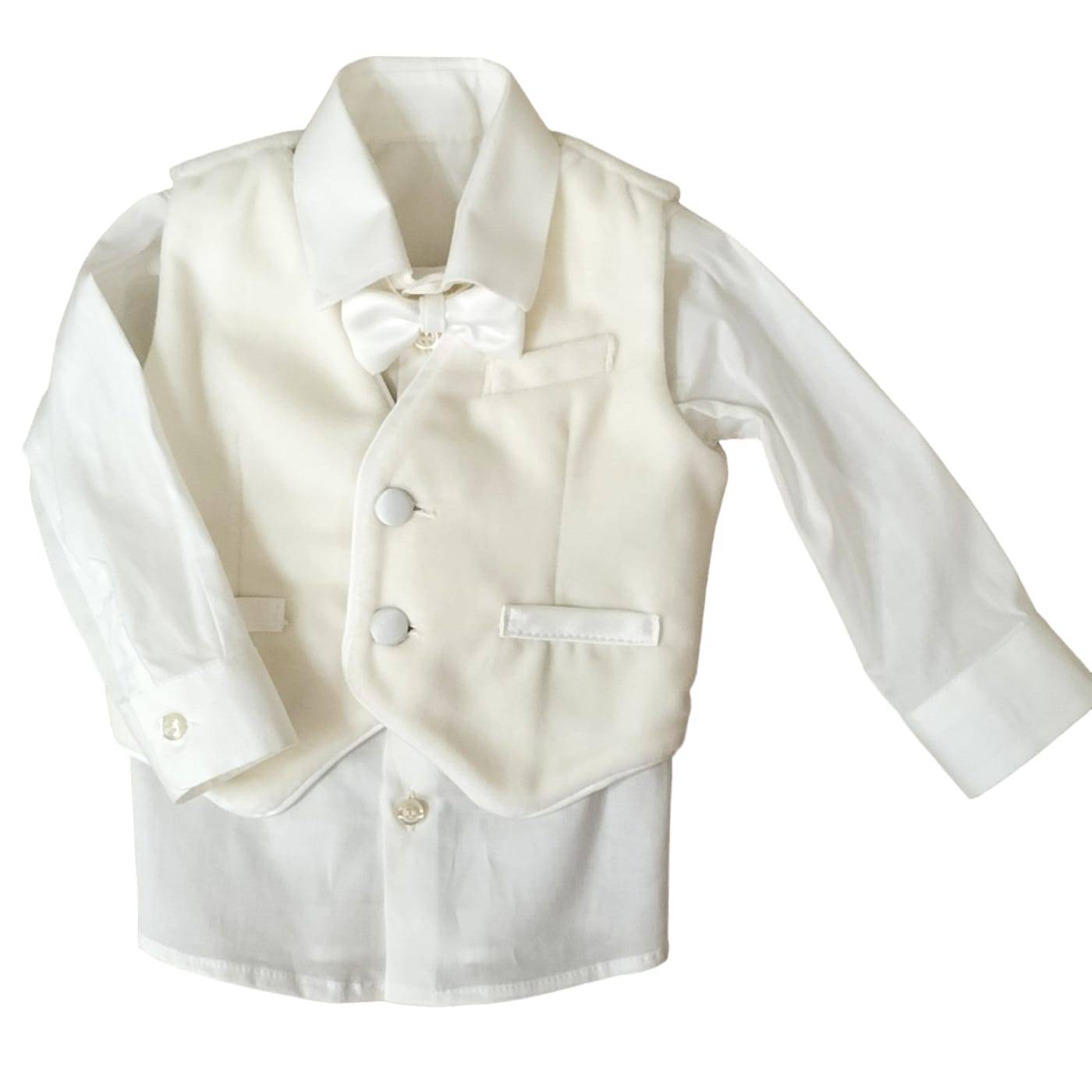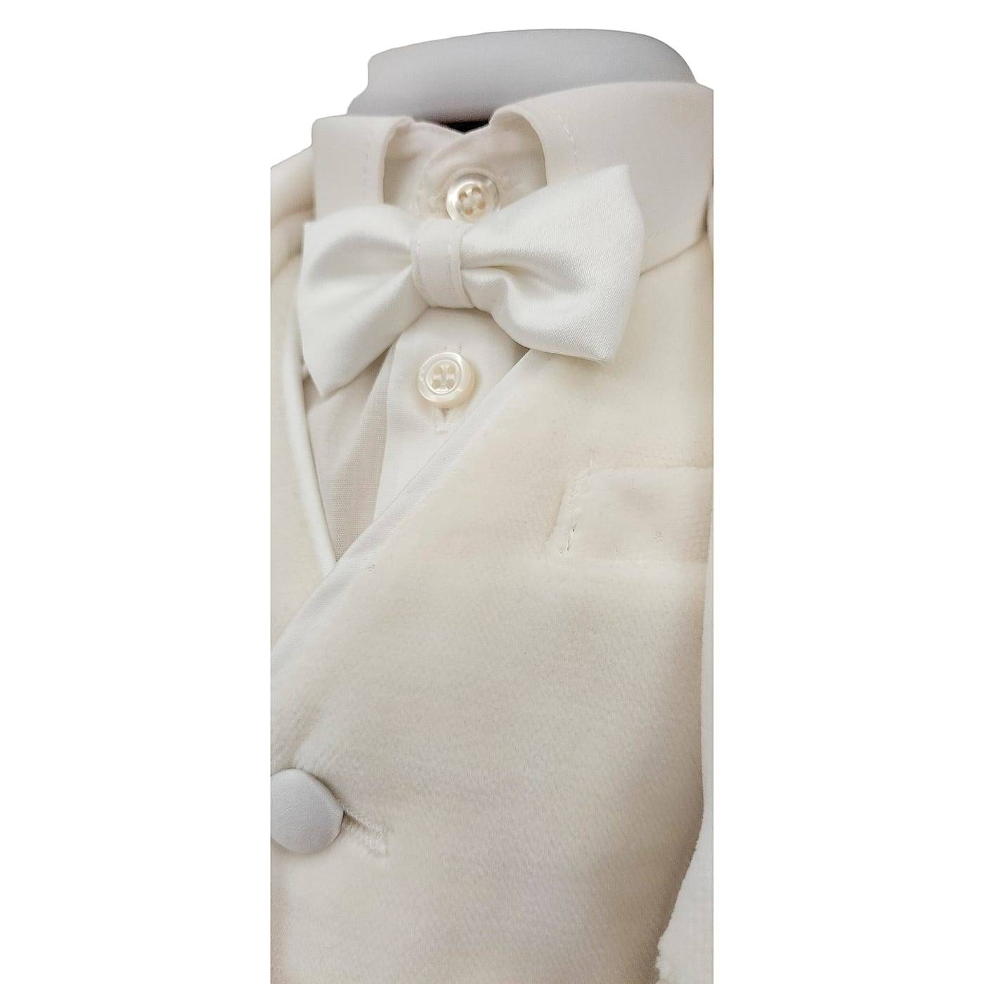 Élégant et complet, ce costume d'enfant en velours crème clair est idéal pour une occasion spéciale en plein hiver, comme un baptême. Le costume se compose d'un pantalon, d'une veste, d'une chemise à manches longues en coton, d'un nœud papillon et d'un gilet, tous accompagnés de détails en satin de soie ton sur ton qui confèrent au vêtement luminosité et élégance (on trouve le nœud papillon en satin, les boutons recouverts de satin, le pantalon avec une bande latérale en satin sur toute la hauteur, le gilet redéfini en satin).
