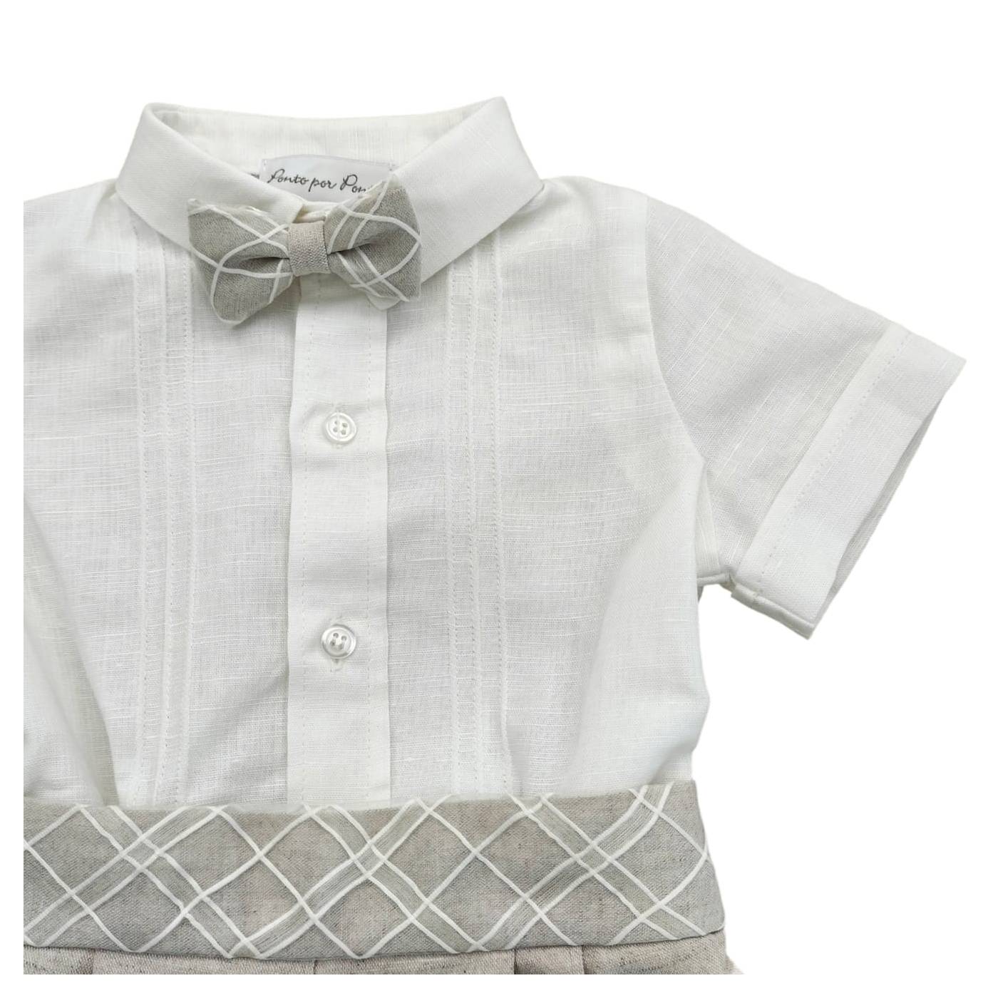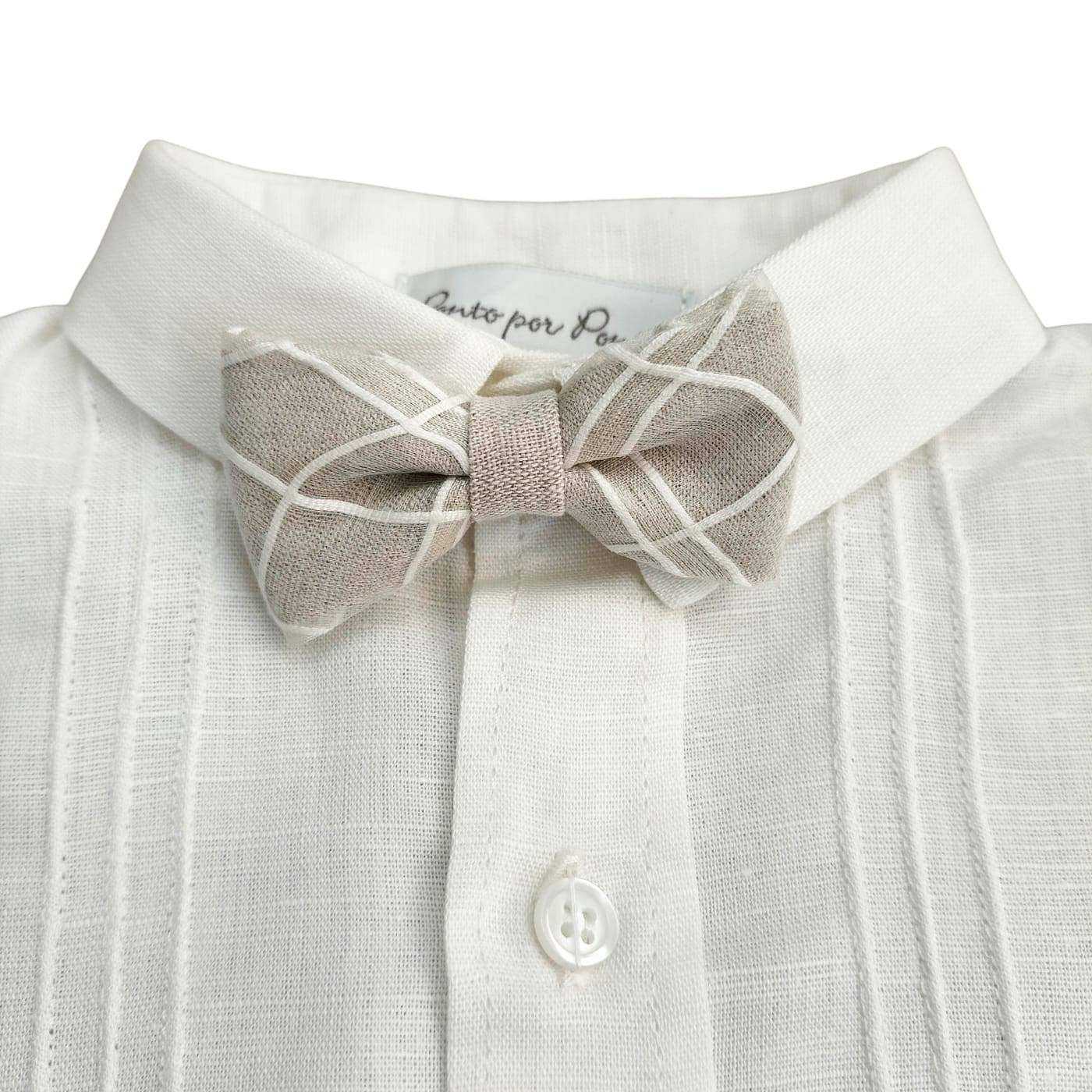 Ensemble pour enfant de style Bon Ton composé d'une chemise à manches courtes de couleur crème et d'un bermuda de couleur lin avec nœud papillon.