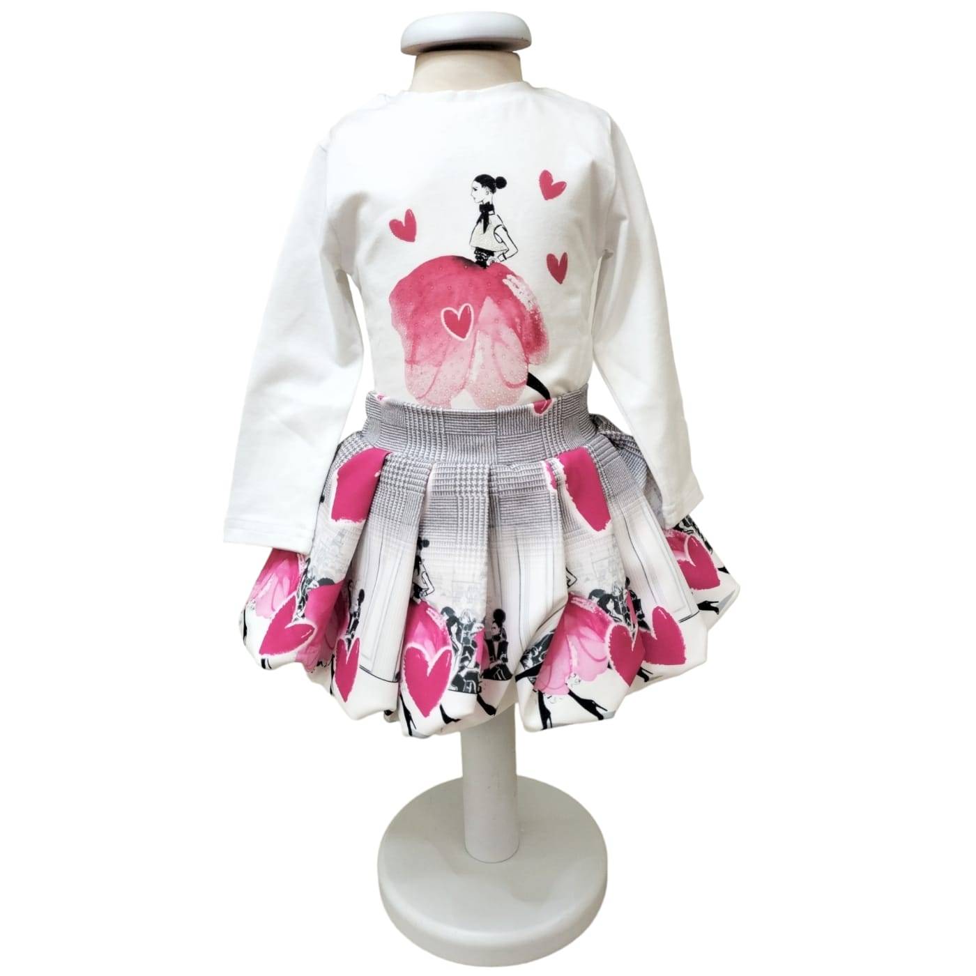 Ensemble composé d'un maillot et d'une jupe de la marque FunFun. Le pull est à manches longues et en coton blanc avec un motif sur le devant accompagné de petites paillettes fuchsia, la jupe large à effet poupée est plissée. Cette tenue chic et décontractée peut être portée par temps froid avec un cardigan chaud ou à la mi-saison.