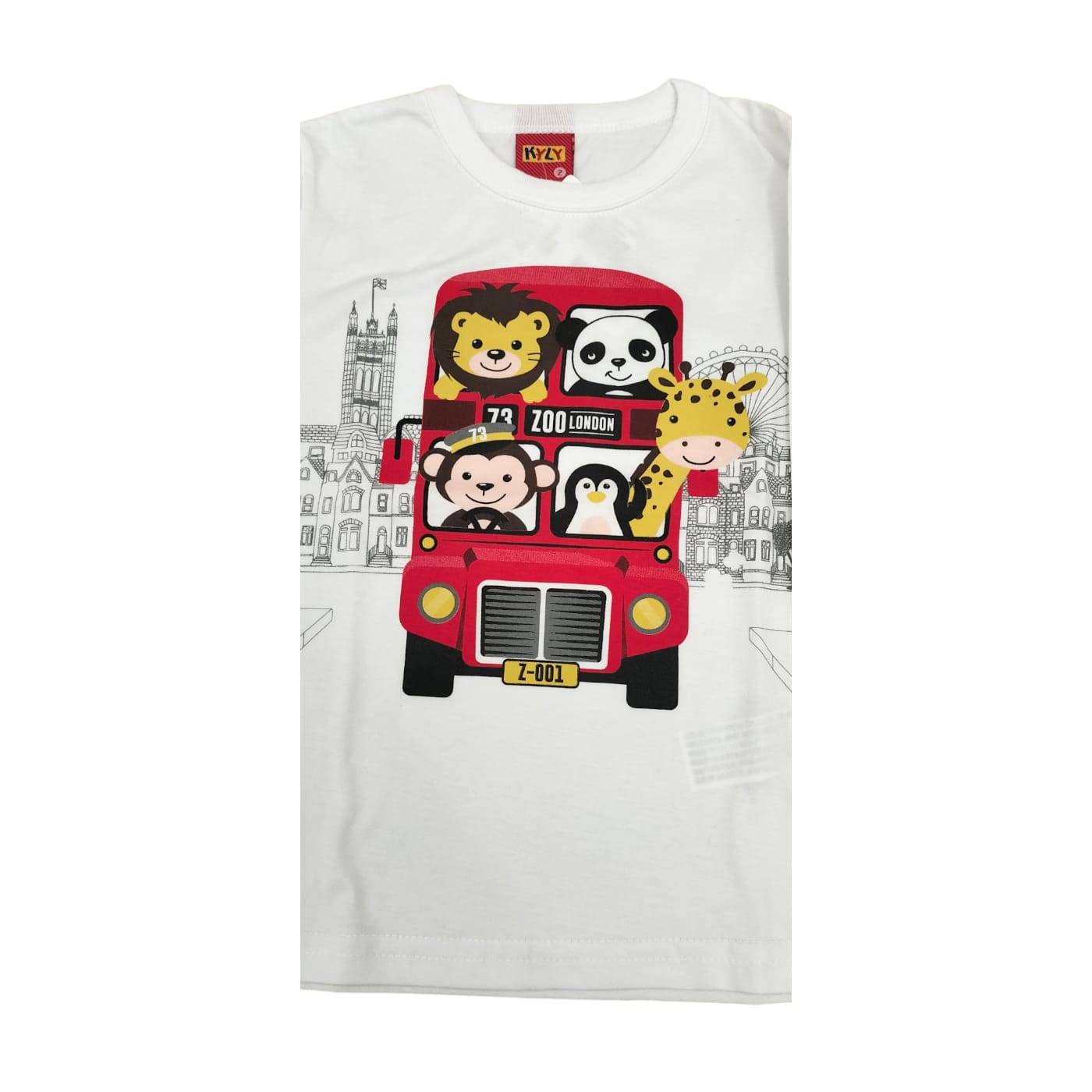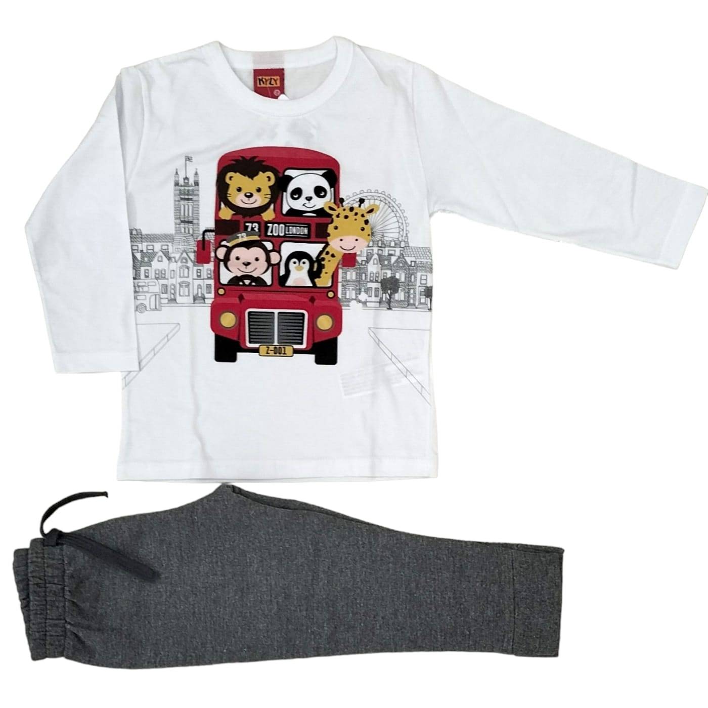 Combinaison pour enfants de 2 ans composée d'un jersey de coton blanc avec motif safari contrasté et d'un pantalon en coton gris gaufré à l'extérieur et molletonné à l'intérieur.