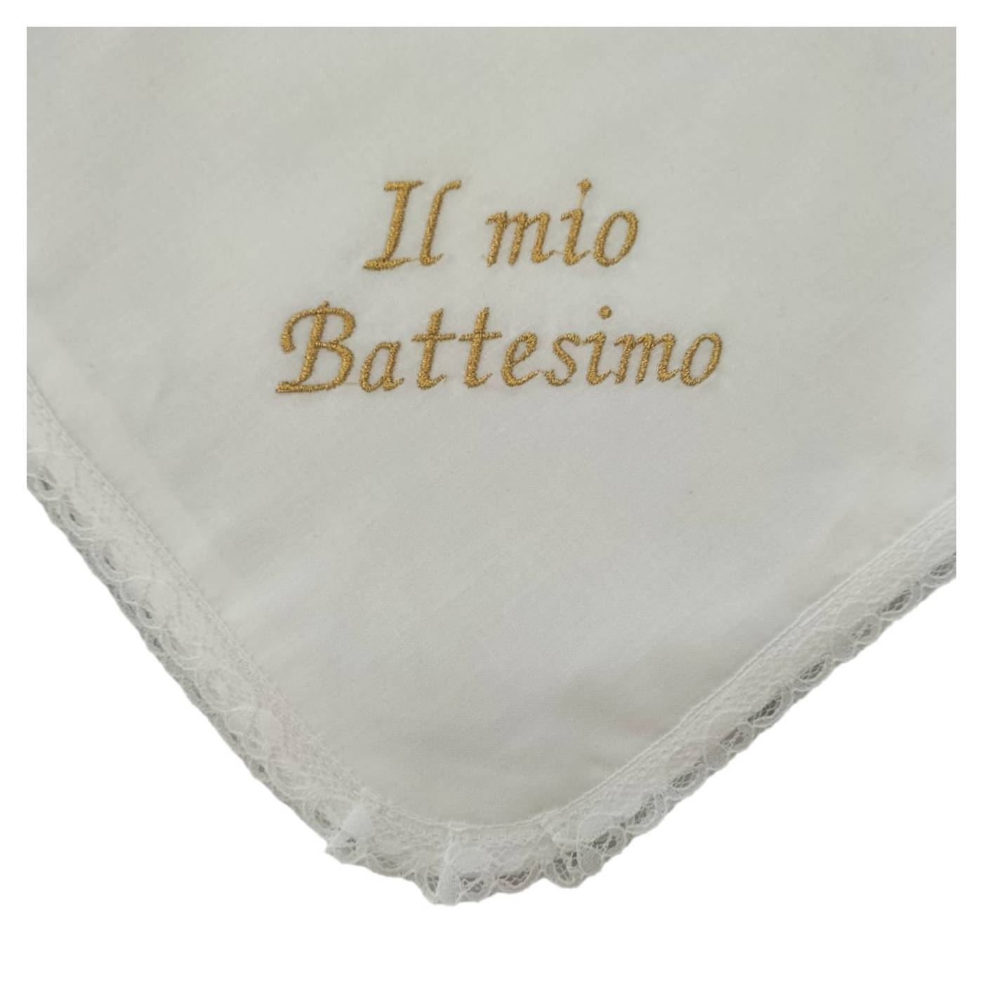Baptismal handkerchief made of soft cotton on a white background redefined with a small tone-on-tone cotton lace and gold-coloured embroidery 'My Baptism'.