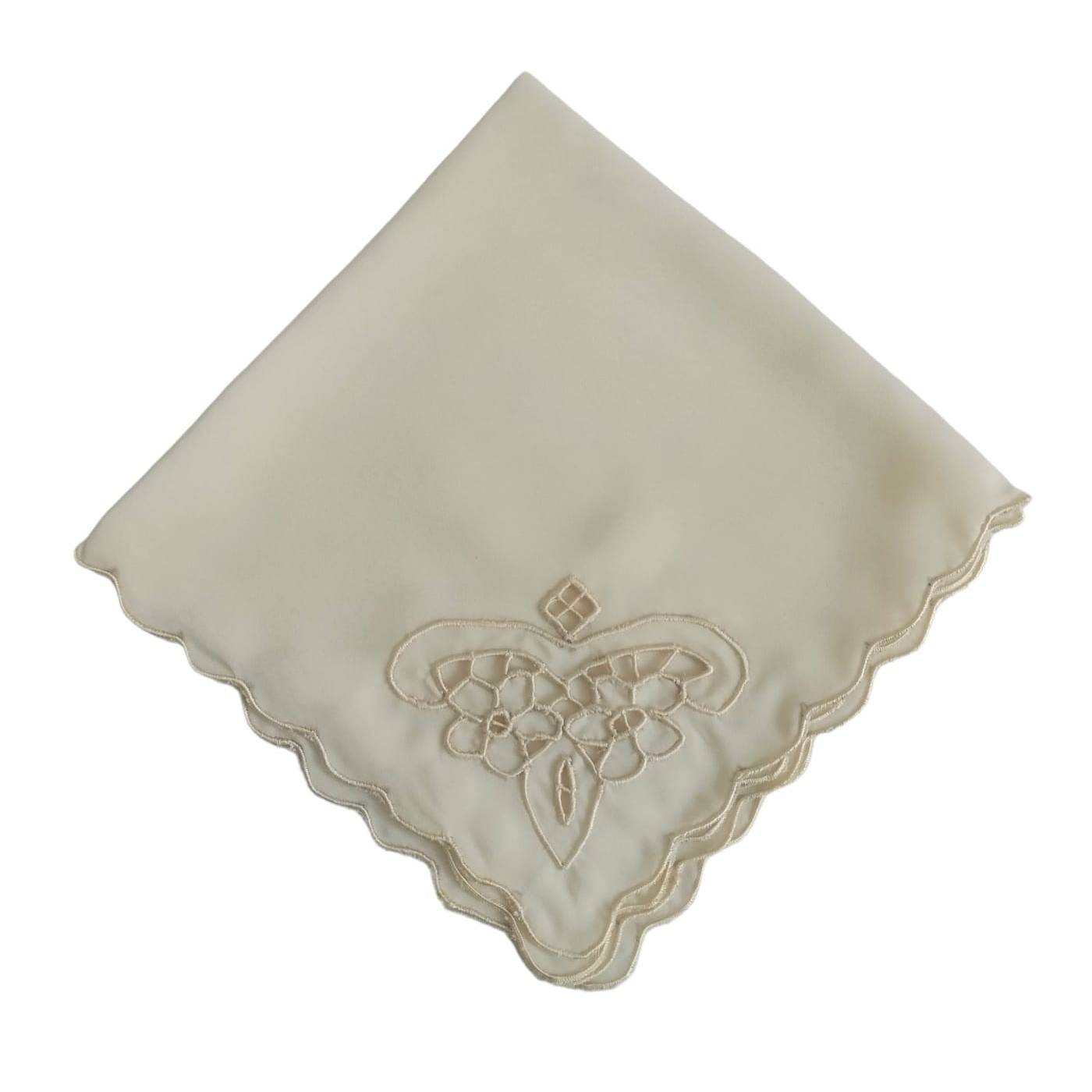 A handkerchief that can also be used for your baby's christening, made of ivory background silk redefined with tone-on-tone emery and traditional cut-stitch embroidery.